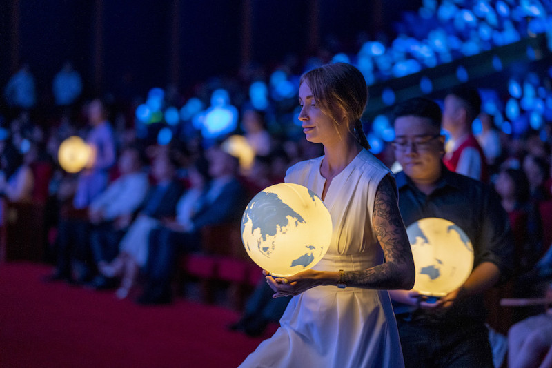 Khoảnh khắc đáng nhớ khi 100 quả cầu ánh sáng được 100 diễn viên đa quốc tịch, đa màu da từ mọi hướng, cùng tiến về sân khấu.