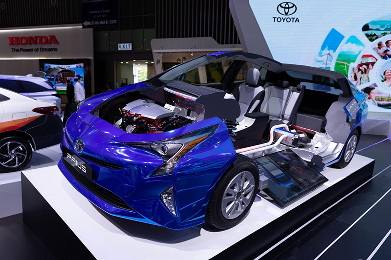 Tại triển lãm, sự xuất hiện của Toyota Prius - mẫu hybrid bán chạy nhất thế giới thu hút sự quan tâm lớn của công chúng. Mô hình mặt cắt trình diễn khả năng vận hành song song của hai động cơ xăng, điện giúp xe đạt được công suất tối ưu. Khi xe giảm tốc/phanh, động năng sẽ làm quay máy phát điện để nạp điện cho hệ thống pin hybrid. Điều này giúp giải đáp phần nào thắc mắc của khách hàng về công nghệ còn khá mới mẻ tại Việt Nam.