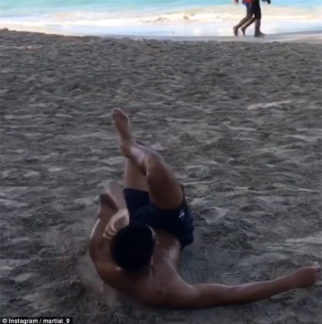 Dù vậy, chân sút 20 tuổi vẫn tích cực rèn luyện thể lực với những bài tập chạy trên bờ biển. Martial cởi trần chạy bộ và tất nhiên là không quên khoe thân hình săn chắc với cơ bụng "6 múi".