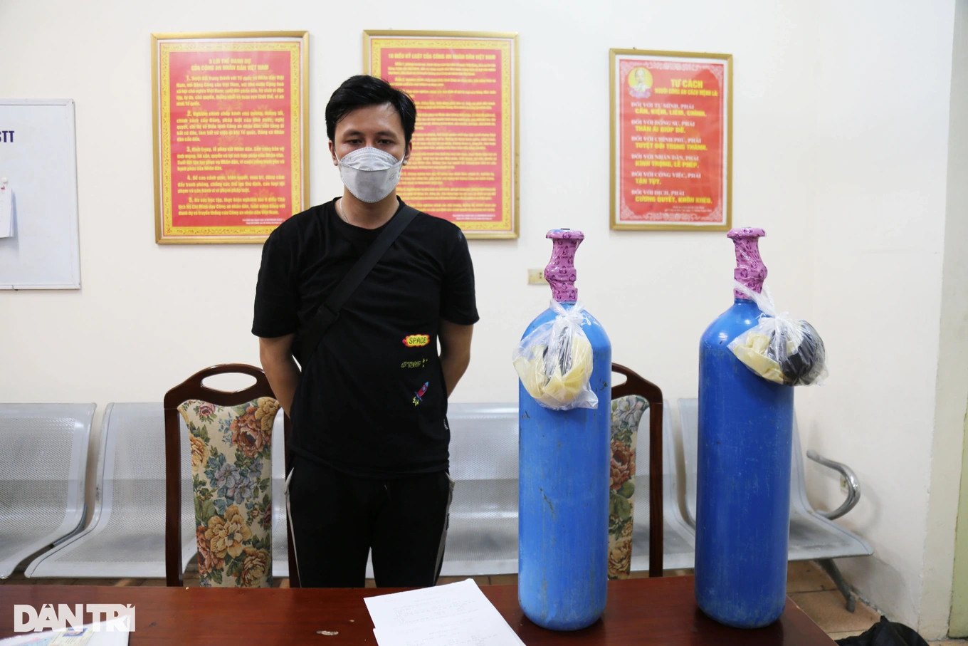 Tại đây, danh tính tài xế được xác định là B.V.H. (26 tuổi, quê Hưng Yên). Qua kiểm tra túi đựng màu đen phía sau xe máy tài xế H., cảnh sát phát hiện 2 bình khí màu xanh. Nói với cảnh sát, tài xế H. khai nhận đây là 2 bình khí cười.