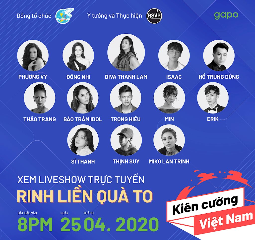 Liveshow có sự tham gia của loạt nghệ sĩ tên tuổi NSƯT Thanh Lam, Hồ Trung Dũng, Phương Vy, Đông Nhi, Trọng Hiếu, Min, ISAAC, Thảo Trang, Bảo Trâm Idol, Erik, Sĩ Thanh, Thịnh Suy, Miko Lan Trinh… cùng sự góp mặt đặc biệt của Hoa hậu Ngọc Hân, Hoa hậu Khánh Vân, Á hậu Kim Duyên, Ca sĩ Phan Mạnh Quỳnh, Kim Lý, cầu thủ Quế Ngọc Hải, cầu thủ Quỳnh Như, dưới sự dẫn dắt duyên dáng của MC Minh Xù sẽ được phát sóng vào 20h ngày 25/4 trên YouTube RSVP Vietnam.