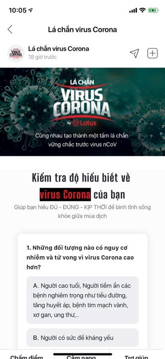 Ngoài ra, trên mạng xã hội Lotus sẽ có những bài test, cung cấp kiến thức cho người dùng thông qua bài kiểm tra online được cập nhật liên tục. Câu trả lời được tập hợp từ các bài báo, với sự tư vấn của các bác sỹ, chuyên gia y khoa. Cụ thể, phần kiểm tra "Chấm điểm độ hiểu" giúp bạn hiểu đúng, đủ, kịp thời về dịch virus Corona. Còn phần kiểm tra “Độ an toàn của bạn" giúp người dùng tự kiểm tra, tự bảo vệ mình và mọi người xung quanh bằng cách trang bị những kiến thức, thói quen cần thiết.