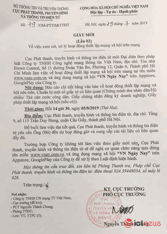 Ngày 29/7/2019, Cục Phát thanh truyền hình và Thông tin điện tử (PTTH&TTĐT), thuộc Bộ TT&TT đã ra văn bản lần 2 để mời Công ty TNHH Công nghệ mạng thông tin Việt Nam, có địa chỉ tại Tòa nhà Etown Central, số 11 Đoàn Văn Bơ, P.12, Quận 4, TP.HCM tới làm việc về hoạt động thiết lập mạng xã hội trên mạng tại địa chỉ tên miền www.vnay.com.vn và ứng dụng mạng xã hội “VN Ngày Nay” trên hai App Store và Google Play. Thời gian Công ty TNHH Công nghệ mạng thông tin Việt Nam đến làm việc tại trụ sở của Cục PTTH&TTĐT là ngày 5/8/2019.