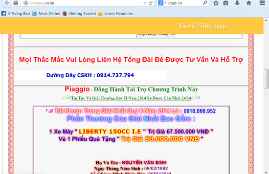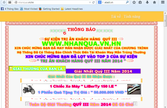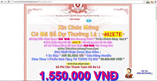 Chị Quỳnh Lê (Khương Thượng - Hà Nội) tham gia mạng xã hội Two từ hơn 2 năm nay. Chị Lê cho biết, khoảng 1 năm trở lại đây địa chỉ email đăng ký làm thành viên Two của chị liên tục nhận được thư thông báo có nội dung: email của chị may mắn trúng thưởng trong chương trình quay số của Two dành cho thành viên. Giải thưởng mà các email này đưa ra thường là xe máy có giá trị như: Novo, Air Blade, Liberty kèm theo tiền mặt từ 35 cho đến 65 triệu đồng. Rồi họ dẫn một đường link đến trang web đề nghị chị khai báo hồ sơ nhận thưởng.