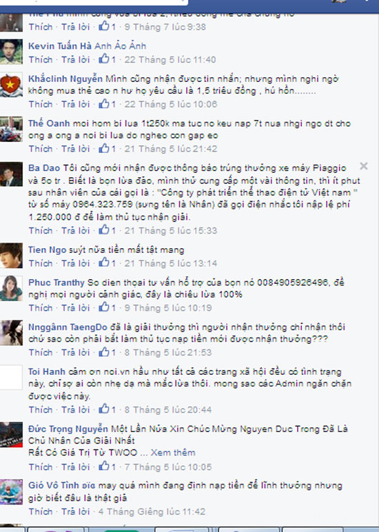 Trên diễn đàn Noi.vn, hàng trăm thành viên của các mạng xã hội đã tố cáo hành vi lừa đảo theo hình thức nạp phí trúng thưởng kể trên. Có khá nhiều người đã trở thành nạn nhân khi làm theo hướng dẫn của những kẻ hướng dẫn làm hồ sơ mà thực chất là chiêu lừa tiền của bọn chúng. Có người bị lừa vài trăm nghìn, có trường hợp than thở bị lừa tới 2 triệu đồng, một số vụ điển hình người dân cả tin để các đối tượng xấu “móc túi” hàng chục triệu đồng...