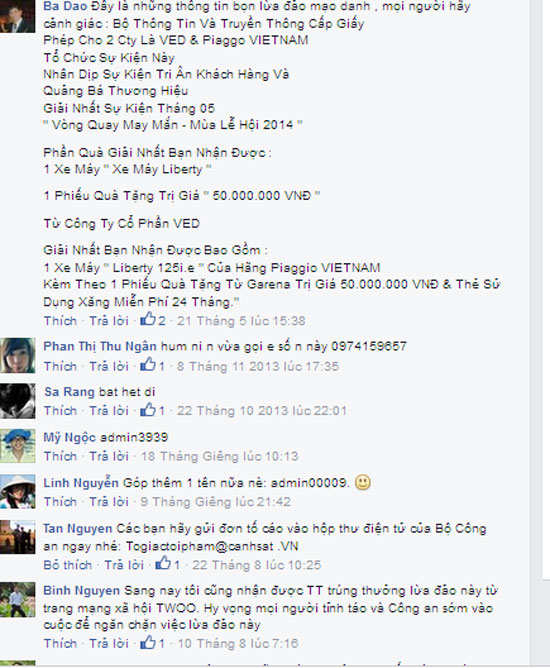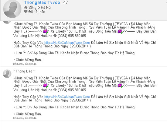 Ngày 31/7/2014, chị V.A ở quận Đống Đa (Hà Nội) cũng nhận được thông báo trên mạng Twoo.com cho biết chị trúng giải nhất sự kiện “Tri ân khách hàng - Quý III” bao gồm 1 xe máy Liberty 125 và 50 triệu đồng tiền mặt. Chị V.A làm theo hướng dẫn của nhóm người giả mạo này và chuyển cho chúng gần 60 triệu đồng qua mã thẻ cào.