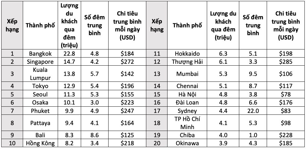 Theo đó, Hà Nội đứng vị trí thứ 15 và Hồ Chí Minh vị trí thứ 18 trong tổng số 161 thành phố với tổng lượng khách qua đêm lên đến 8,9 triệu lượt với chi tiêu trung bình mỗi ngày lần lượt là 78 USD và 98 USD.