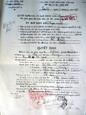| Quyết định cấp 400m2 đất của UBND huyện Can Lộc cho ông Đặng Quang Cảnh, sau đó ông này đã chuyển nhượng toàn bộ diện tích này cho ông Cơ. |