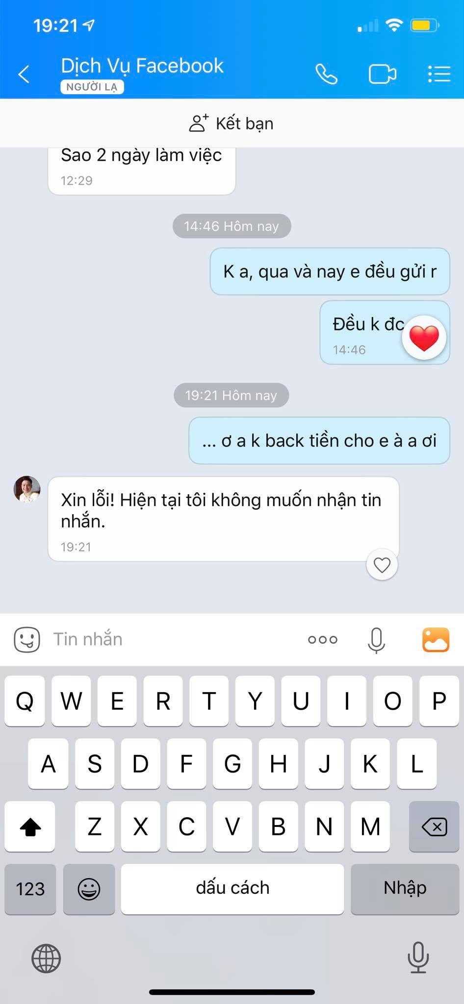 Chị Thuý Hạnh (TP. HCM), cũng là một nạn nhân của "dịch vụ Facebook" lừa đảo cho biết: "Tài khoản Facebook của mình bị hack, có nhờ một người làm dịch vụ Facebook lấy lại với chi phí 700,000 đồng. Sau khi chuyển tiền thì mình bị chặn liên lạc, không thể làm gì được nữa. Sau đó mình kiểm tra thì mới biết người này từng lừa đảo rất nhiều người trước đó."