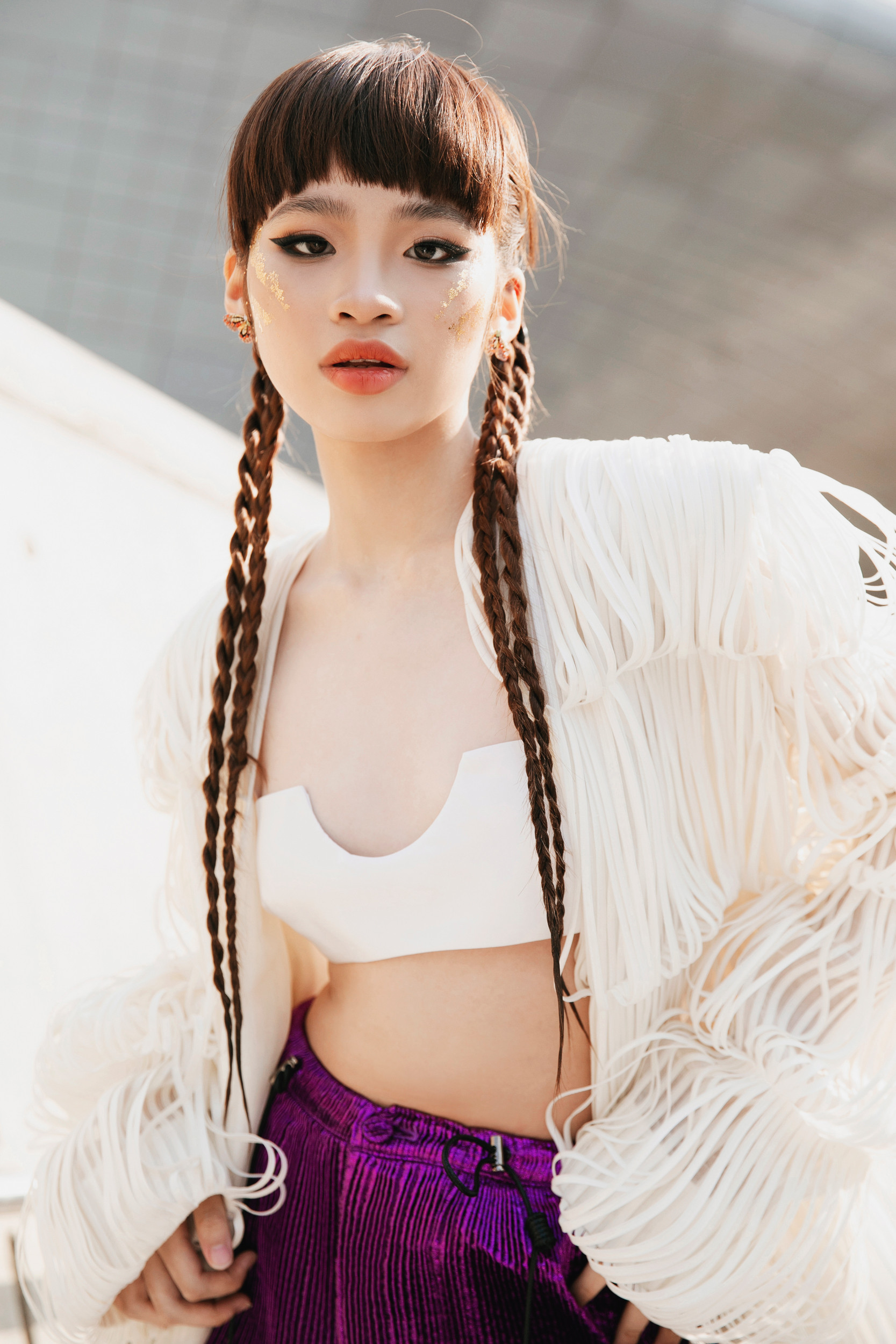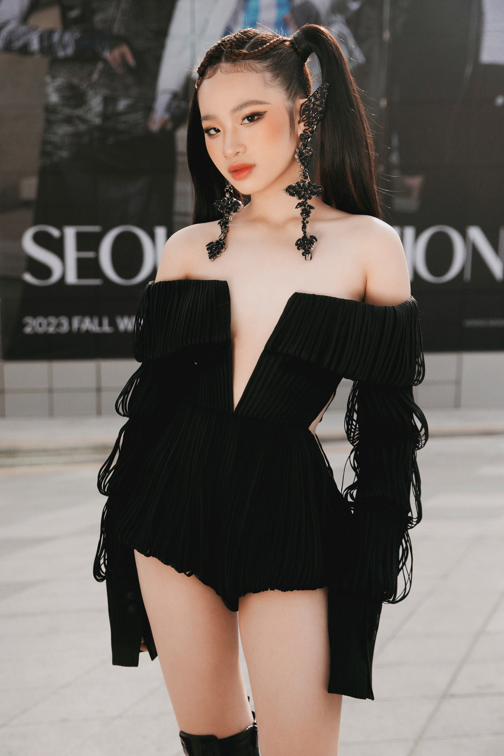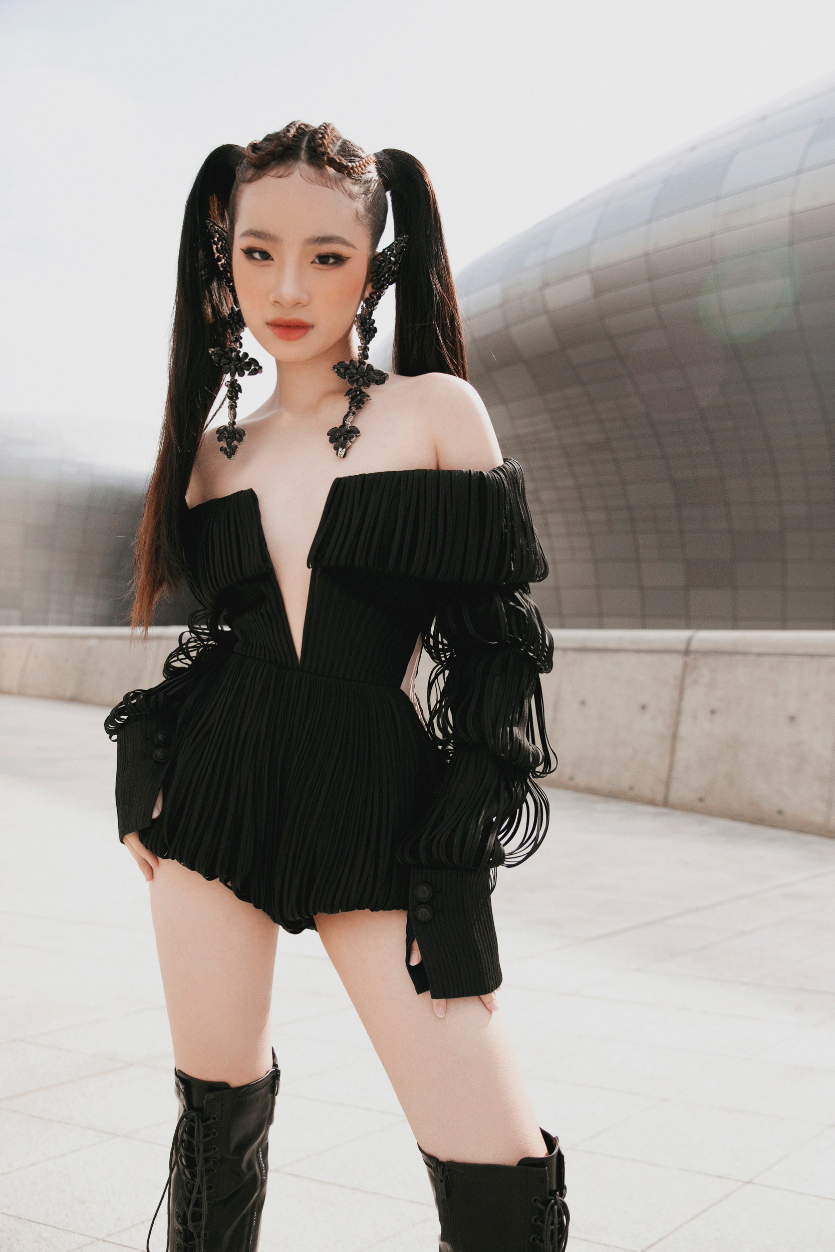 Bảo Hà được NTK Nguyễn Công Trí chọn lựa, tư vấn trang phục để xuất hiện tại sự kiện thời trang ở Hàn Quốc.Bảo Hà nổi bật trong bộ jumpsuit đính kết tua rua tỉ mỉ. Mẫu nhí khoe được vóc dáng mảnh mai, thần sắc sang chảnh khi xuất hiện tại sự kiện.Phần ngực của bộ trang phục được cắt xẻ táo bạo, giúp Bảo Hà khoe trọn bờ vai thon. Mẫu nhí kết hợp cùng hoa tai to bản, đôi boots da cá tính và kiểu tóc buộc hai bên, tạo nên một tổng thể hài hòa thu hút sự chú ý của truyền thông quốc tế.Khoác trên mình bộ trang phục của NTK Nguyễn Công Trí, Bảo Hà toát lên vẻ năng động trẻ trung nhưng cũng có phần tinh nghịch, mạnh mẽ.Mẫu 14 tuổi diện áo crop top khoe eo phối áo "lồng đèn" và quần ống rộng, vừa trẻ trung vừa cá tính.
