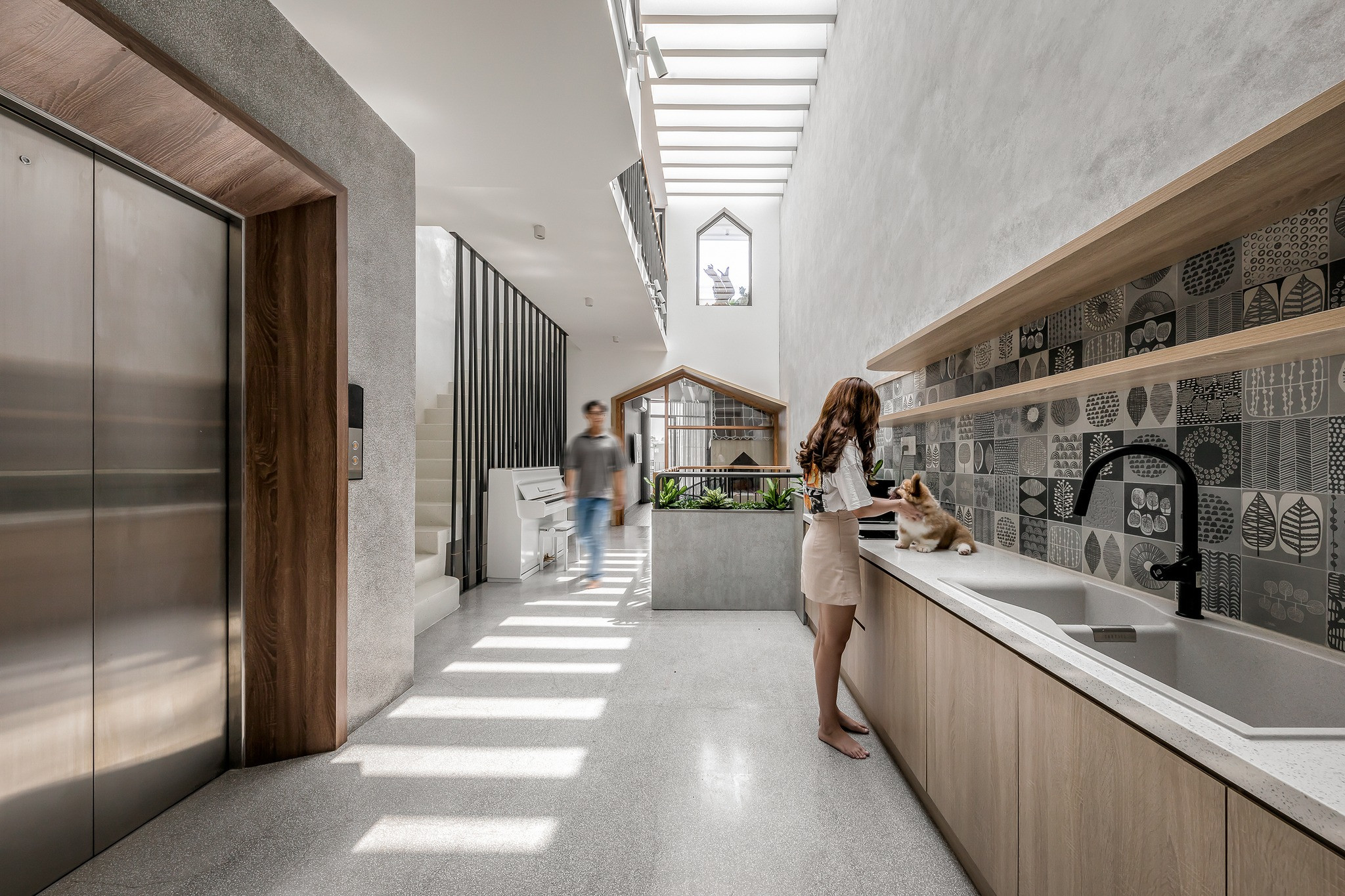 Không gian bếp hướng đến thiên nhiên. Trong nhà lắp đặt thang máy cho mọi người thuận tiện khi di chuyển.