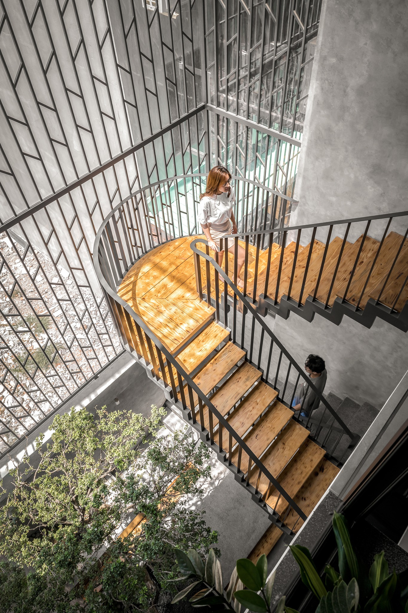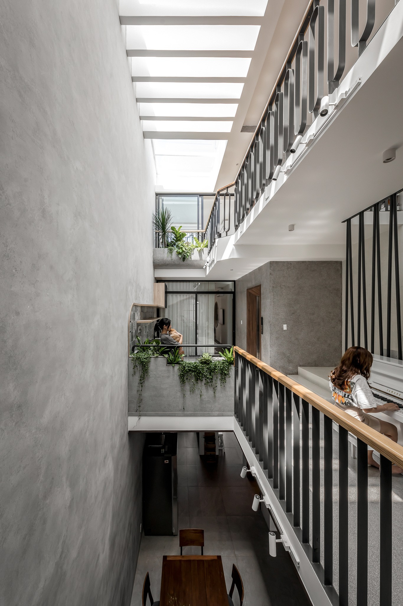Nhờ khoảng thông tầng và giếng trời, mọi người ở các không gian có thể kết nối với nhau dễ dàng.