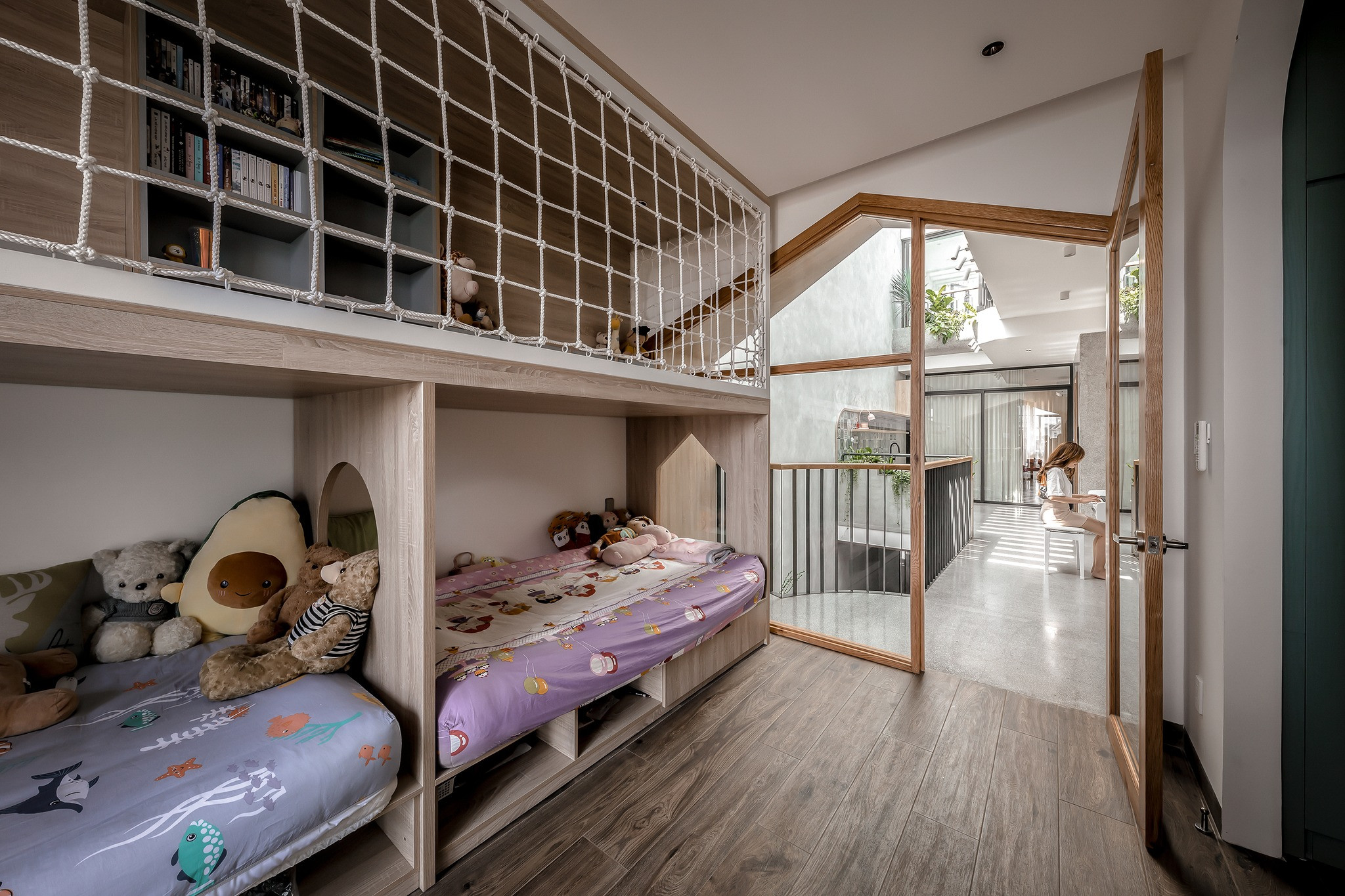 Phòng ngủ kết hợp phòng giải trí, học tập cho các bé với luồng gió mát thông suốt. Hệ giường tầng hiện đại phân chia khoảng không rõ ràng, đảm bảo các con vẫn có sự riêng tư cần thiết dù ở chung phòng.