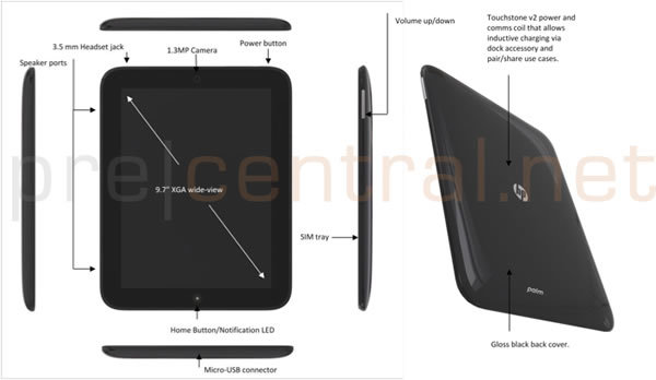 Tài liệu trông có vẻ xác thực này do PreCentral tiết lộ, cùng với một series ảnh chụp mô hình mẫu của Topaz, tên mã của mẫu tablet. Các tính năng đáng chú ý bao gồm: màn hình 9,7 inch, vi xử lý lõi kép Qualcomm MSM8660 tốc độ 1,2 GHz, RAM 512MB, bộ gia tốc và la bàn số tích hợp, cổng microUSB và hỗ trợ tuỳ chọn cho mạng HSPA hoặc LTE không dây.