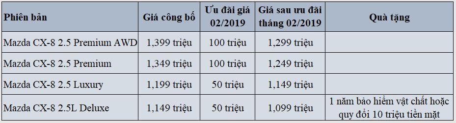 Hai phiên bản Mazda CX-8 Luxury và Mazda CX-8 2.5 Deluxe có mức giảm 50 triệu đồng. Giá hiện tại của 2 phiên bản này lần lượt là 1,149 tỷ đồng và 1,099 tỷ đồng.
