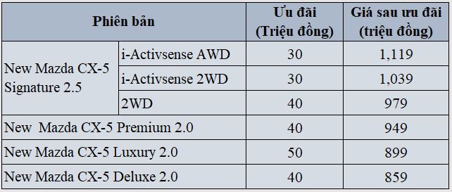 Phiên bản cao cấp nhất là New Mazda CX-5 2.5 Signature (1 cầu và 2 cầu) với bộ tính năng an toàn i-Activsense cũng được giảm 30 triệu đồng. Với mức giảm này, giá Mazda CX-5 sau ưu đãi có giá bán từ 859 triệu đồng đến 1,119 tỷ đồng.