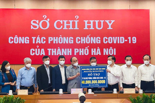 Tại buổi làm việc, đoàn công tác của Chủ tịch nước Nguyễn Xuân Phúc đã trao tặng UBND TP. Hà Nội 40 tỷ đồng, trong đó Ngân hàng TMCP Quân đội tiếp tục đóng góp 20 tỷ đồng, chung tay cùng Thủ đô đẩy lùi dịch bệnh.