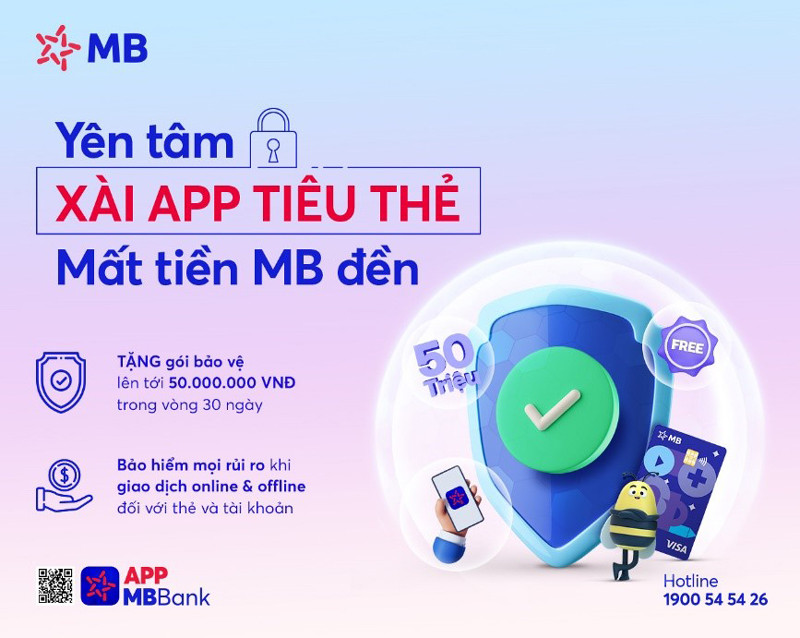 MB tiếp tục tung ra chương trình tặng gói bảo vệ 50 triệu đồng trong 30 ngày cho tất cả khách hàng đang sử dụng dịch vụ của MB. Khách hàng có chi tiêu Thẻ tín dụng và Thẻ ghi nợ quốc tế trong tháng từ 1 triệu đến dưới 10 triệu sẽ được tặng khiên bảo vệ “Mất tiền MB đền” khỏi các rủi ro mất tiền với hạn mức 50 triệu đồng cho tháng kế tiếp. Ngoài ra, khách hàng sẽ được nâng mức bảo vệ lên 100 triệu đồng trong 1 năm nếu có chi tiêu tích lũy Thẻ tín dụng và Thẻ ghi nợ quốc tế từ 10 triệu đồng.