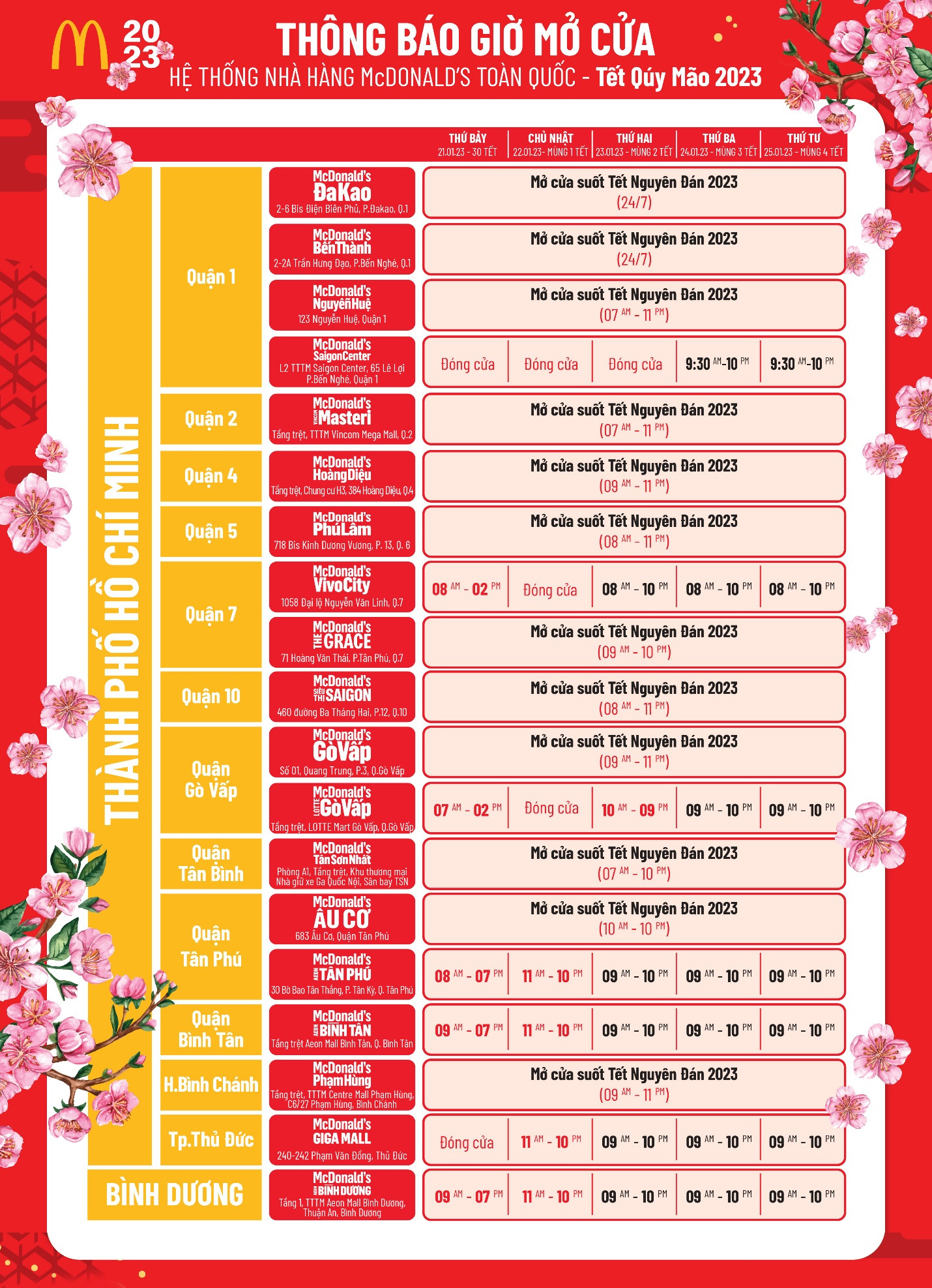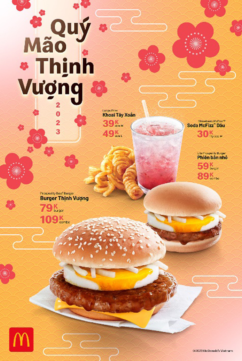 Tết đến Xuân về là dịp người người nhà nhà sum họp, quây quần cùng nhau trong tình yêu thương, gắn kết, chia sẻ những câu chuyện may mắn, hạnh phúc. Nhân dịp này, McDonald’s đem trở lại thực đơn Thịnh Vượng với chiếc bánh burger Thịnh Vượng, khoai tây xoắn may mắn và thức uống McFizz dâu cát tường nhằm gửi đến thực khách thực đơn thơm ngon, tiện lợi, với ước vọng vào một năm mới an khang thịnh vượng. Đây là năm thứ 8 McDonald’s mang đến cho thực khách Việt Nam thực đơn Thịnh Vượng vào dịp năm mới.