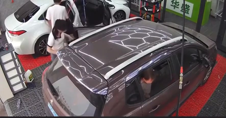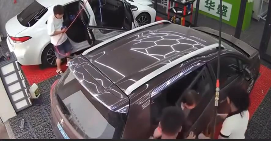 Những người có mặt ở tiệm rửa xe ngay lập tức chạy đến xem xét tình hình. Thấy cô bé bị kẹt cứng, hai, ba người đàn ông đã cố gắng kéo tấm kính xuống để cô bé có thể thở dễ dàng hơn. Trong khi đó, người mẹ vội vàng bấm nút hạ kính xe.