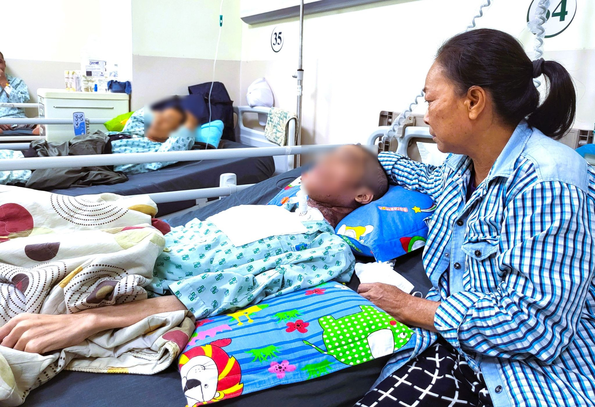 Bà Lưu Thị Thanh Tâm (57 tuổi, Đồng Tháp) túc trực bên giường bệnh tại Khoa Chăm sóc giảm nhẹ, Bệnh viện Ung bướu TP.HCM đã nhiều ngày. Con trai bà là anh L.T.L (20 tuổi) đang nằm bất động, cơ thể gầy gò và suy kiệt, phải mở khí quản, đặt ống sonde dạ dày.