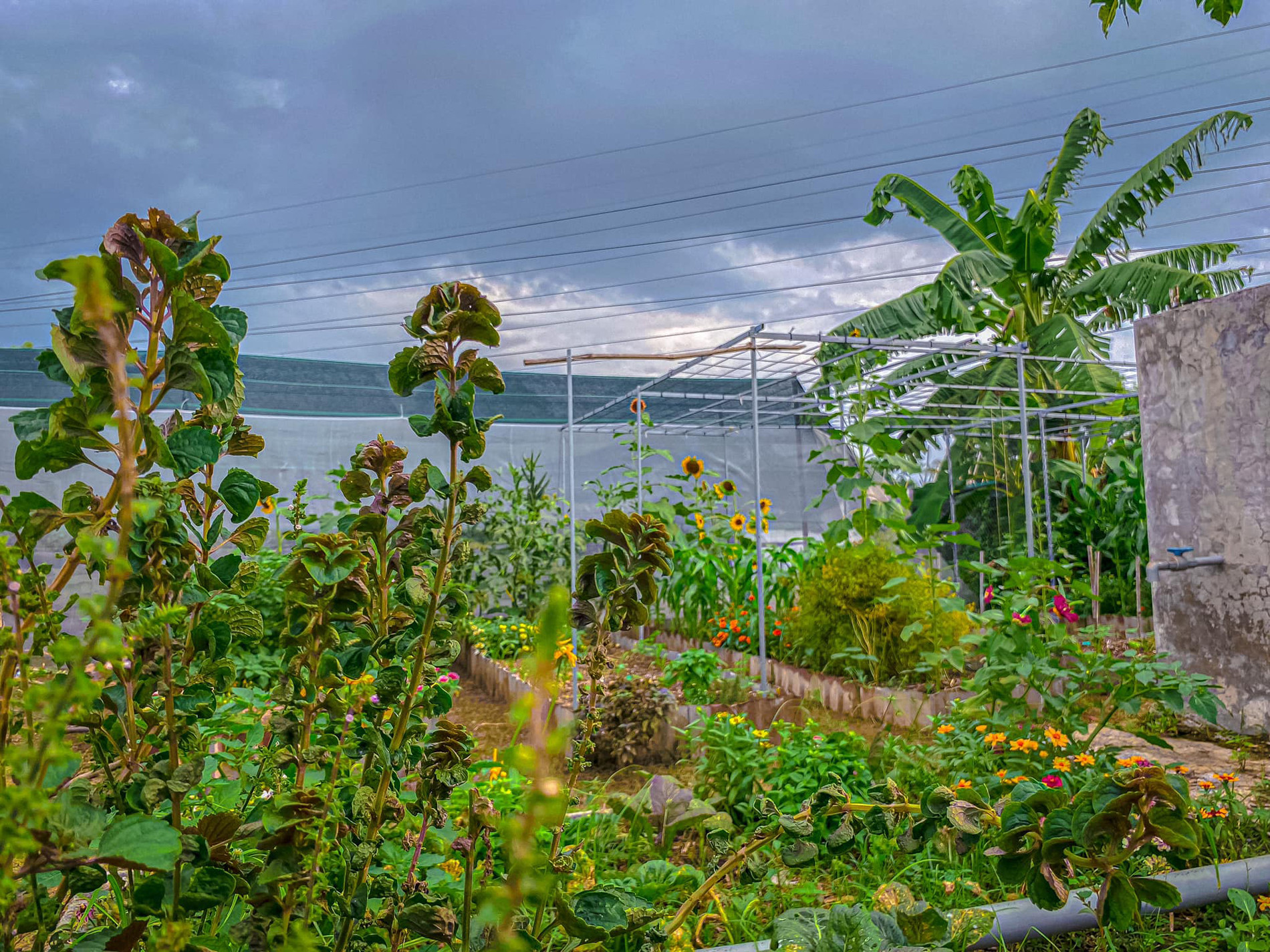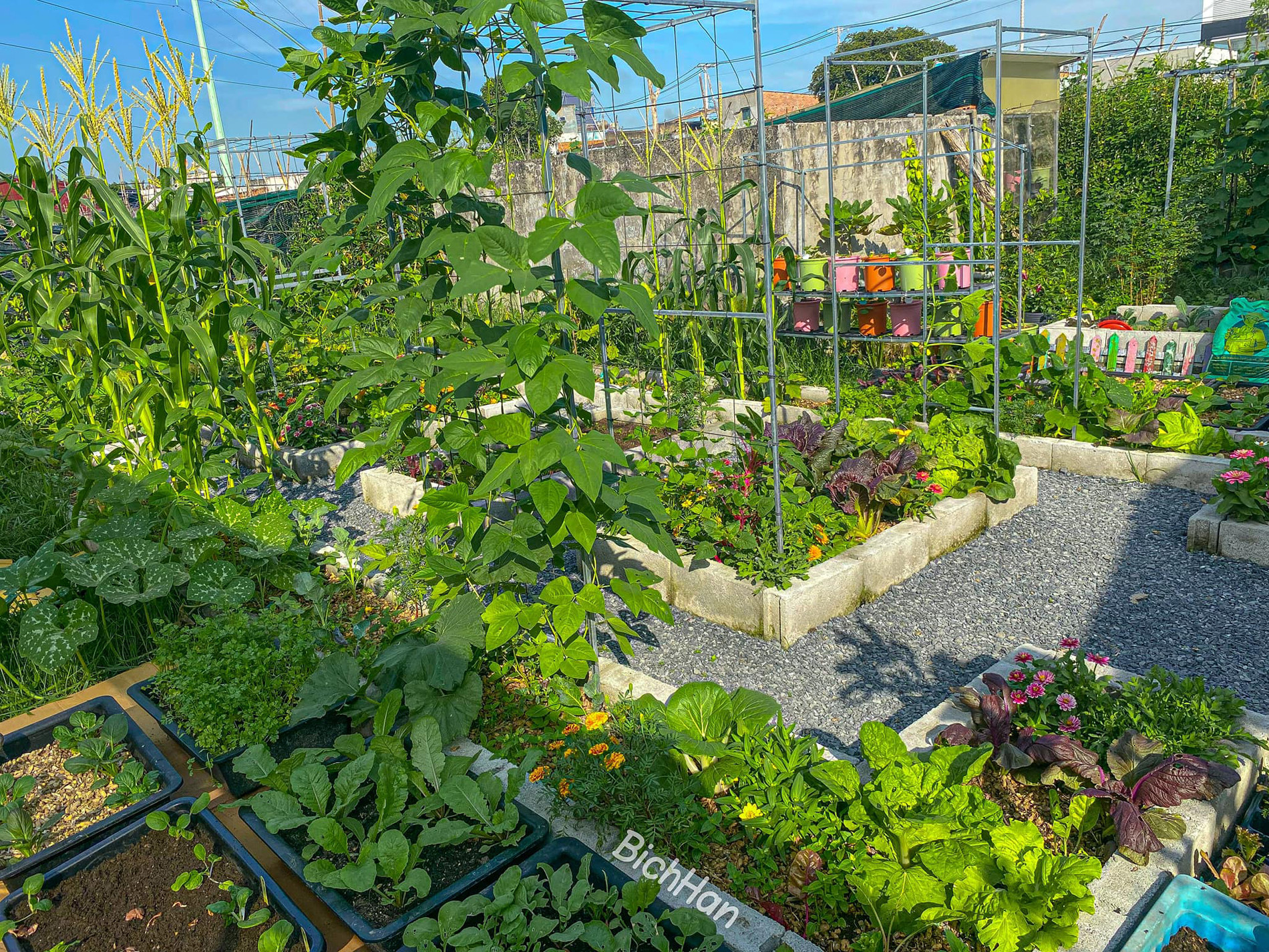 Khu vườn hiện có tổng diện tích khoảng 100m2, được phân chia thành 1 khu trồng rau các loại, xung quanh là cây ăn trái và 1 nhà màng nhỏ để trồng rau mùa mưa, 1 nhà ươm.