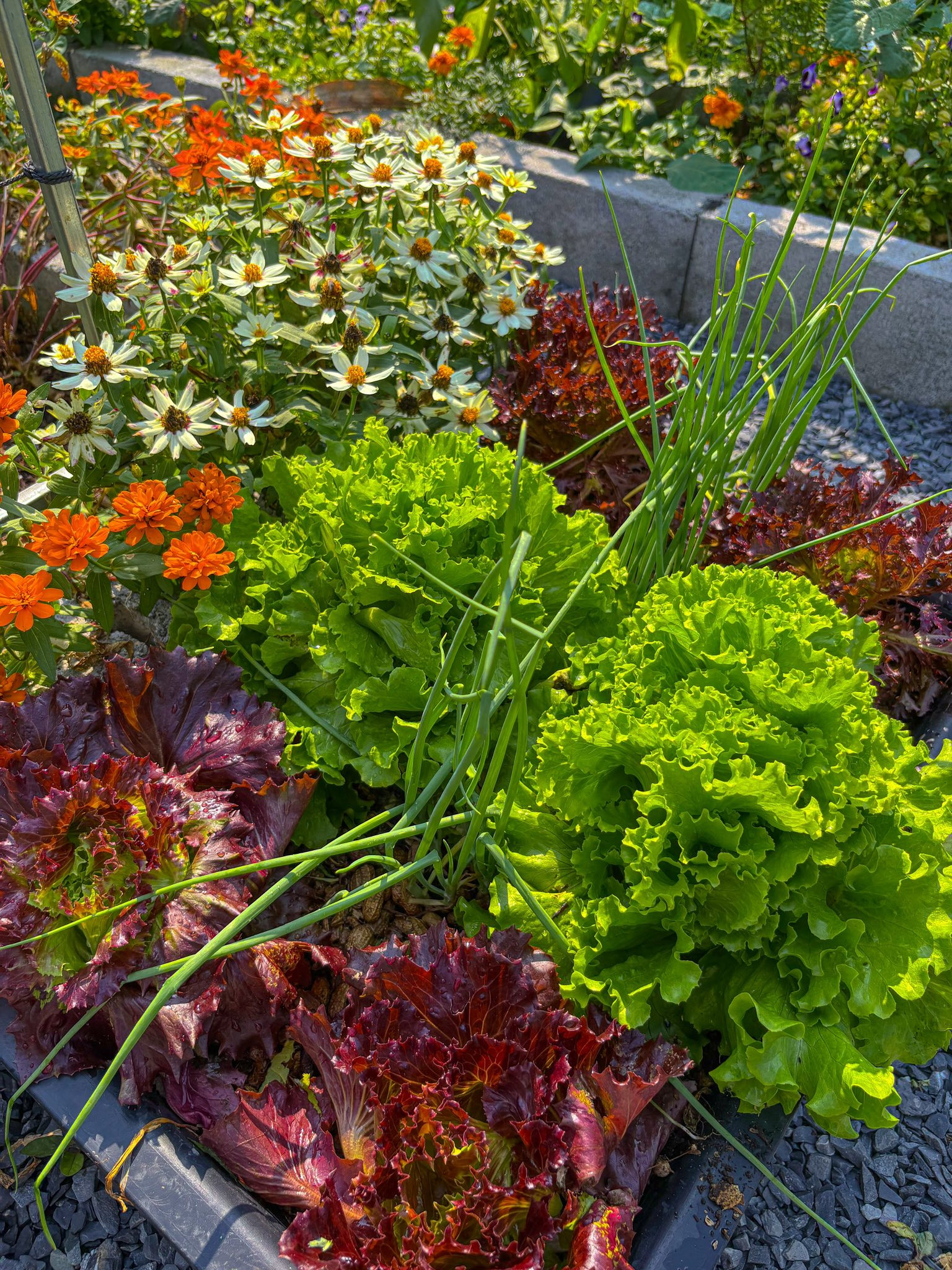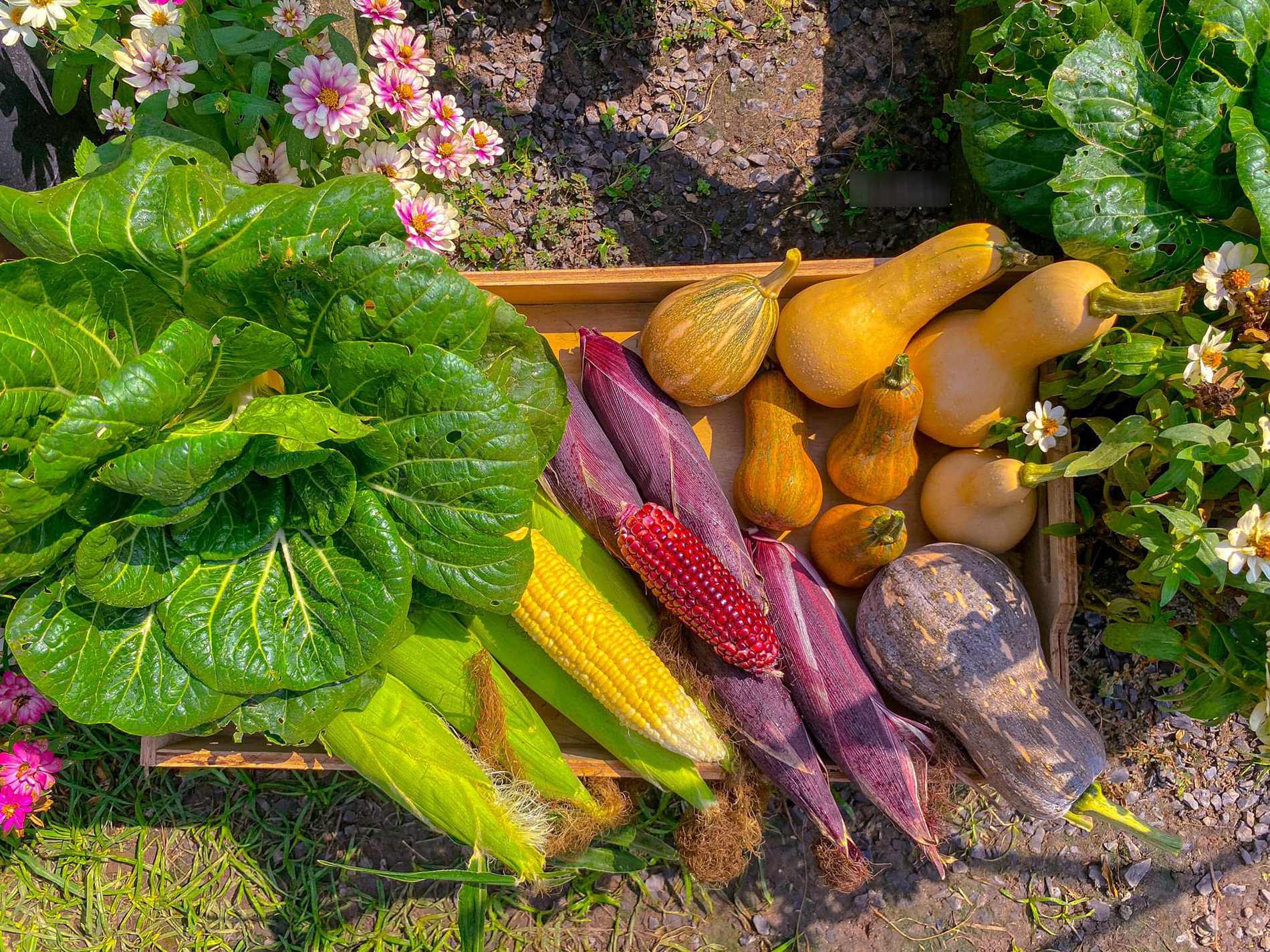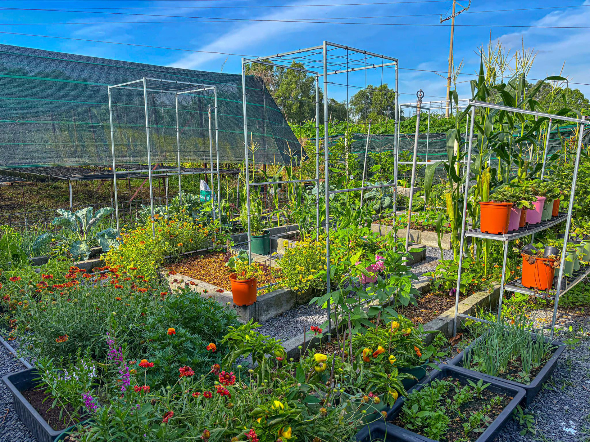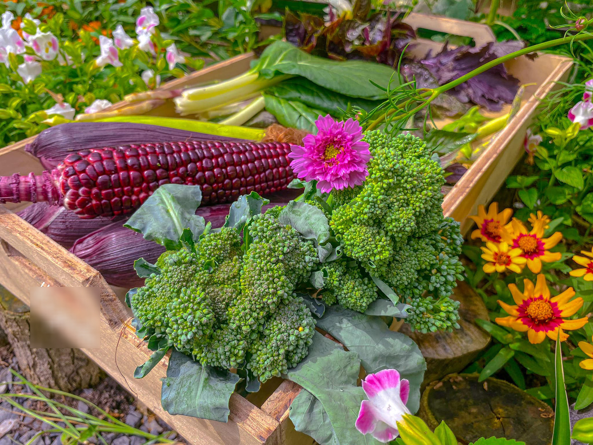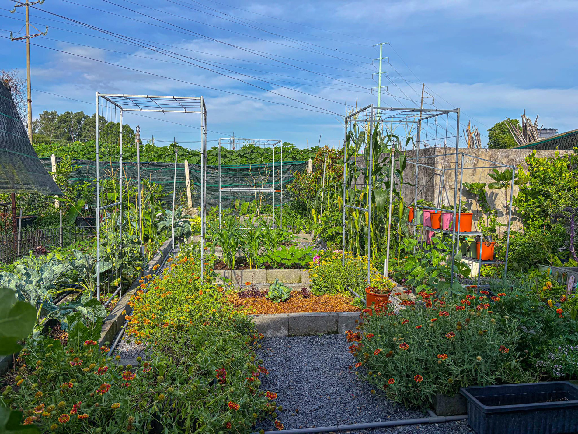 Trong vườn hiện có nhiều loại rau ăn lá và cho quả như rau ngót, rau dền, rau muống, đậu bắp, đậu đũa, đậu nành,... Một số giống súp lơ được trồng từ năm trước đến giờ vẫn phát triển tốt.