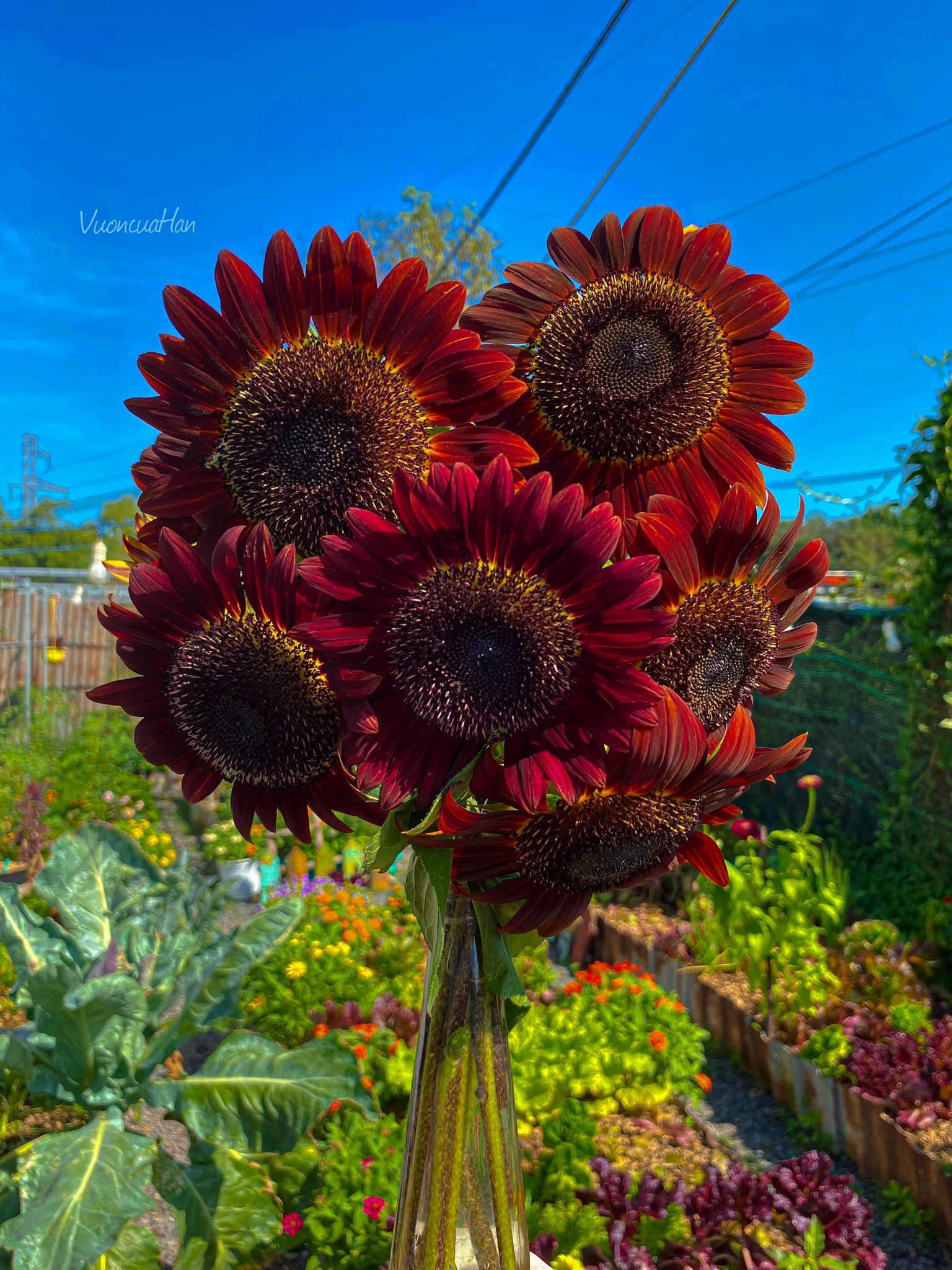 Điểm thú vị là trong vườn có hàng chục loài hoa rực rỡ khác nhau như cúc vạn thọ, hướng dương, sao nháy, cúc nhám cao và lùn, ngọc hân,...