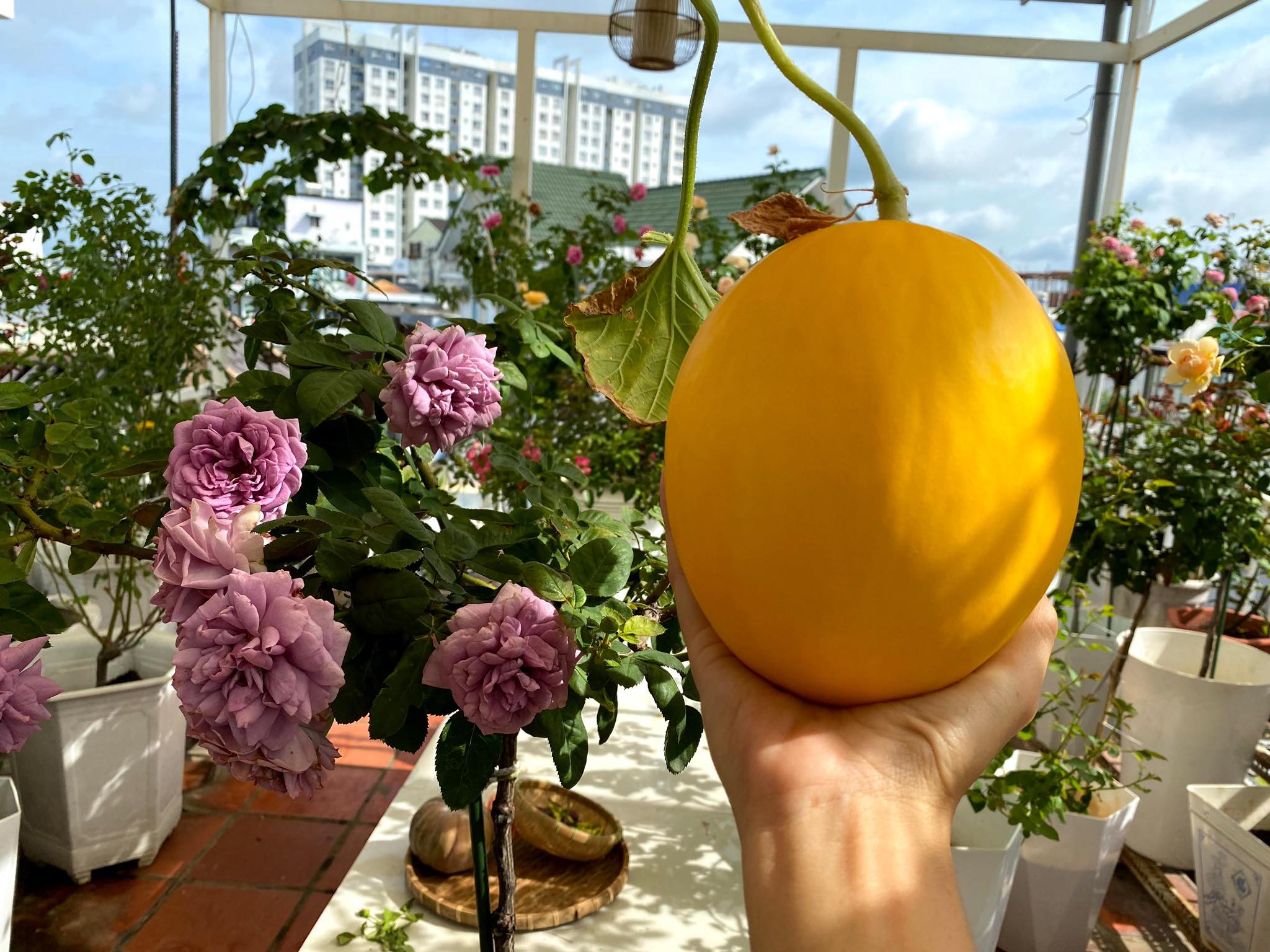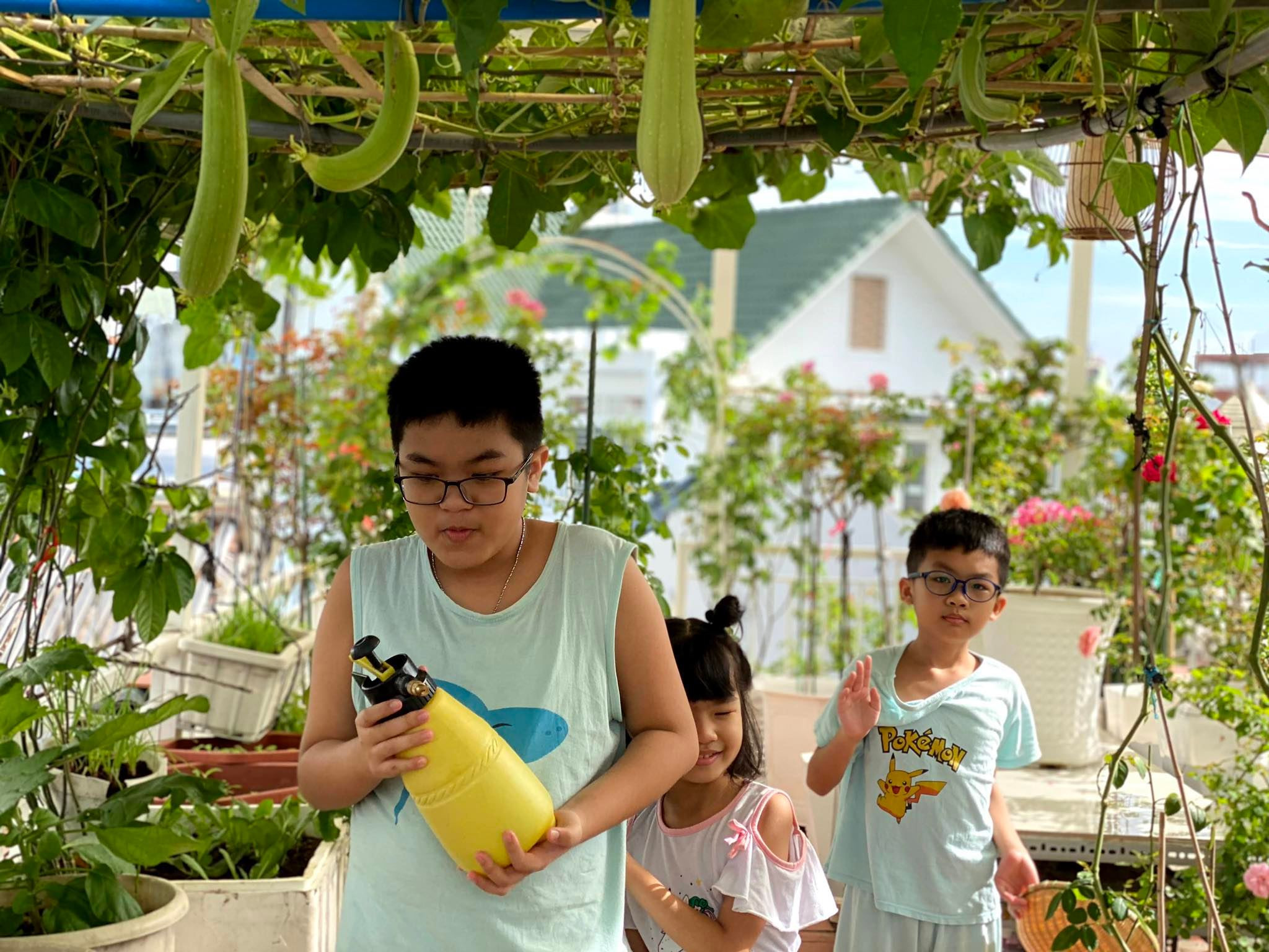 Mỗi lần hoa nở rộ, chị thường bày đồ lên sân thượng cho các con vui chơi, cắm trại, nhất là vào dịp Trung thu hoặc Tết. Thỉnh thoảng, các bé cũng phụ mẹ thu hoạch bầu, mướp, trải nghiệm làm nông dân đầy thú vị chẳng kém gì các khu du lịch sinh thái ở ngoại ô.