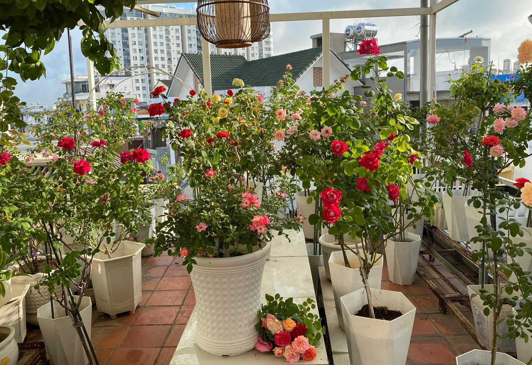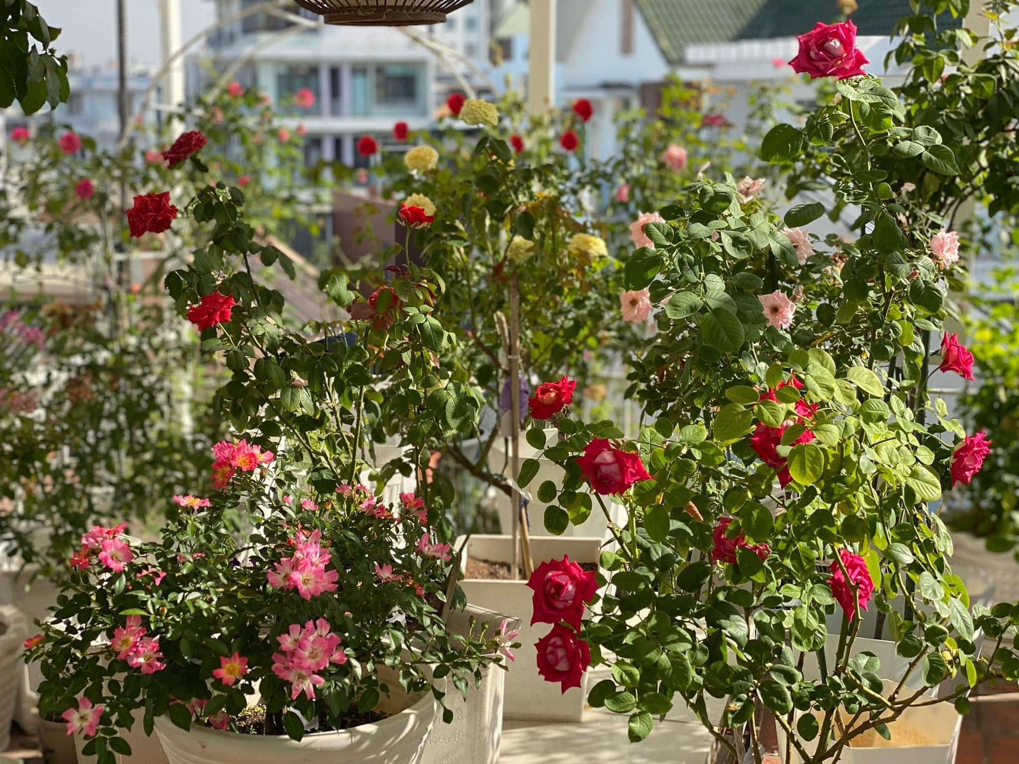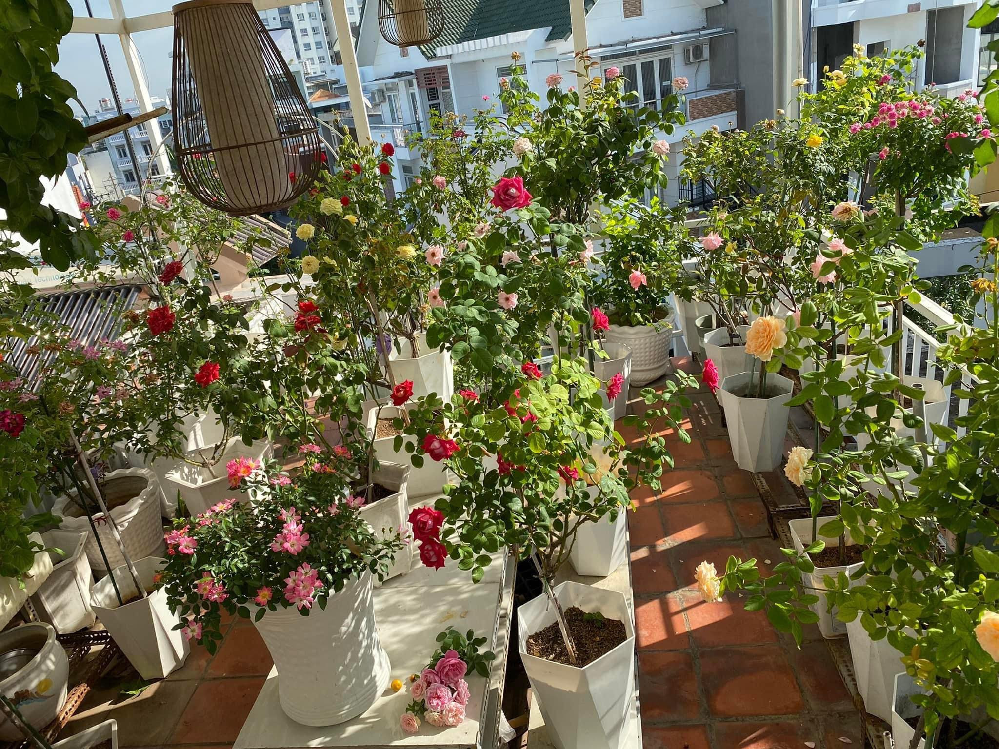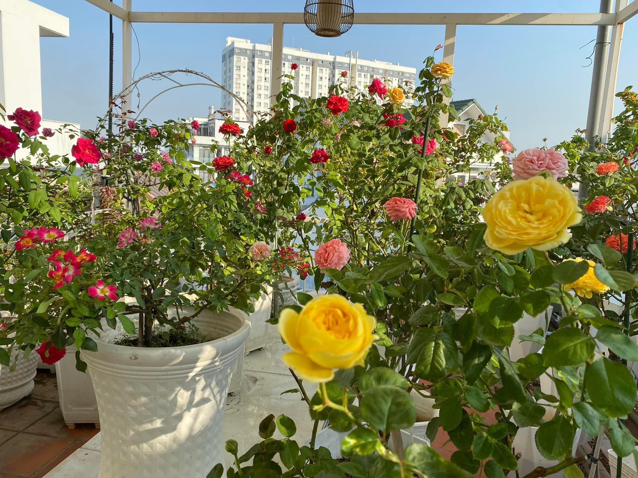 Dù hoa hồng được nhiều người nhận xét là khó trồng, khó chăm sóc nhưng chị Candy vẫn trồng thành công, sở hữu không gian thư giãn tràn ngập hương sắc trên sân thượng.