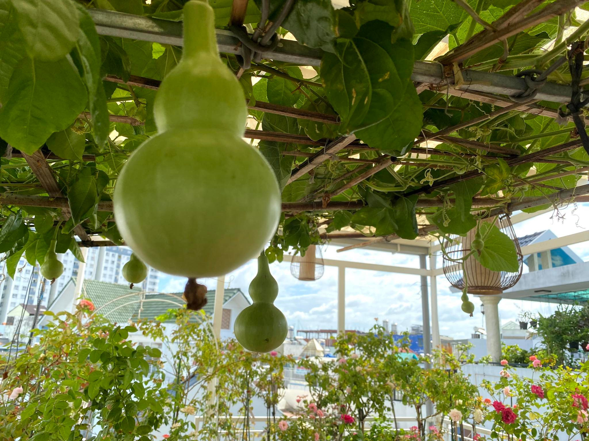 Trên khu vườn sân thượng, ngoài 70 gốc hoa hồng đẹp mê ly, nữ gia chủ 42 tuổi còn trồng thêm một số loại rau củ quả, vừa có nguồn thực phẩm sạch, vừa tăng thêm khoảng xanh mát mẻ, đẹp mắt cho không gian.