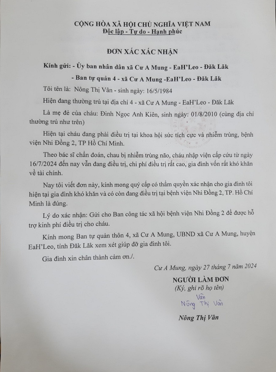 Kiên bị vỡ sọ, xuất huyết não. Sau khi phẫu thuật mở hộp sọ giải áp, lấy máu tụ, em được chuyển từ Đắk Lắk vào Bệnh viện Nhi đồng 2 (TP.HCM). Do tổn thương não nặng, Kiên phải nằm thở máy kéo dài tại phòng hồi sức tích cực. Khoảng 3 tuần trước, khi tình trạng sức khỏe của em có tiến triển khá hơn, bà Vân xin chuyển con trai sang Bệnh viện 1A để theo dõi và tập vật lý trị liệu.