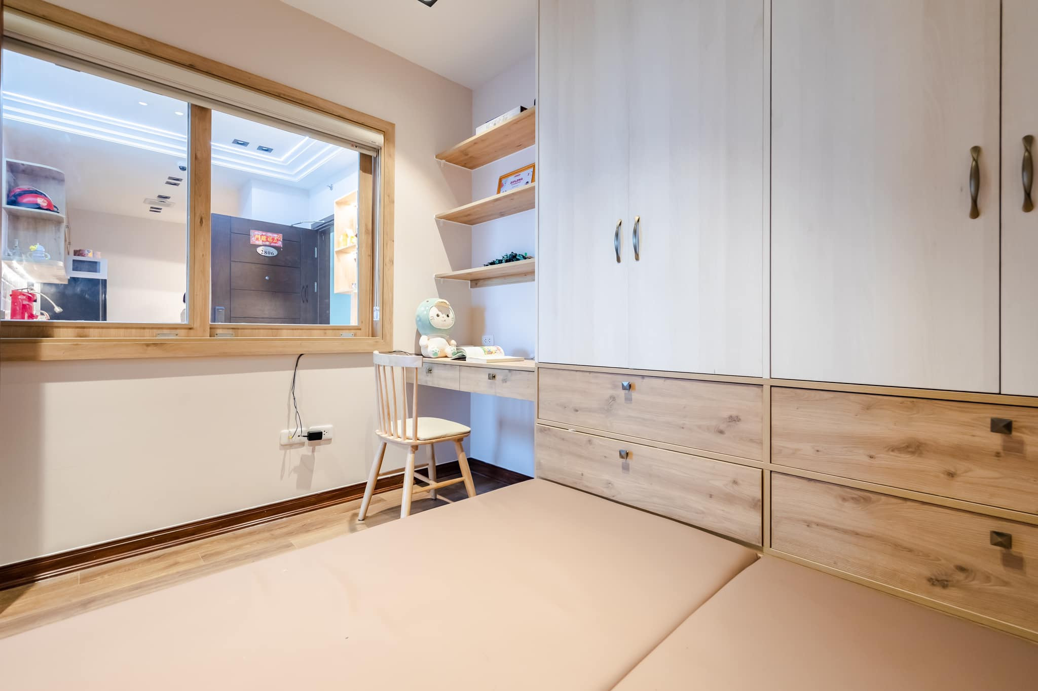 Căn phòng rất nhỏ, chỉ khoảng 10m2, thiết kế CĐT chỉ có 1 ô cửa bé xíu thông ra phía ngoài hành lang. Chị Hằng đã trổ cửa để phòng thoáng hơn, nhìn qua cửa sổ là bàn ăn và bếp. Chị kê được 1 chiếc giường 1.8m với tủ quần áo và bàn học. Do phòng nhỏ nên chị thiết kế hệ tủ và giường liền khối. Phần gầm giường thành hộc chứa để tăng diện tích lưu trữ.