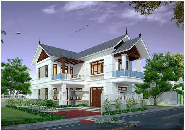 Biệt thự vườn 2 tầng chữ L sử dụng gam màu trắng sáng kết hợp với mái thái đơn giản mà tinh tế. Ảnh:Thanglongarc.
