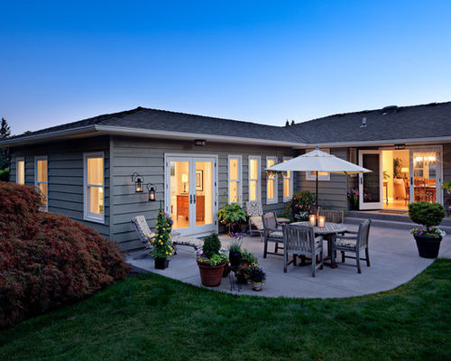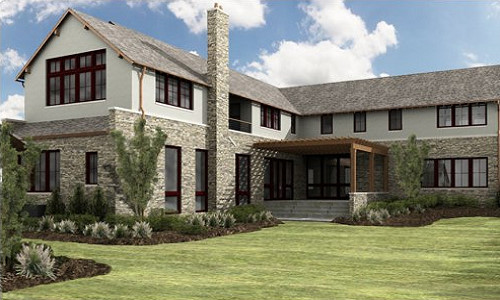 Biệt thự chữ L nổi bật với hệ mái xám và sân cỏ rộng, thoáng mát. Ảnh: Ken Lauher.