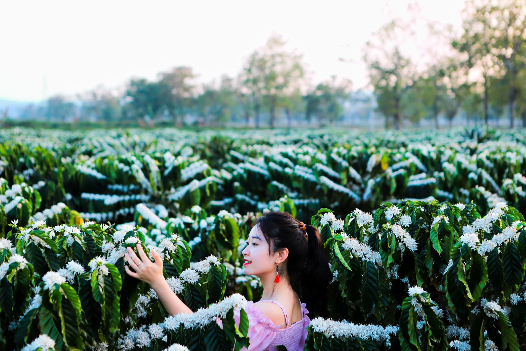 Thời điểm lý tưởng nhất để chụp hình với hoa cà phê là vào buổi sáng hoặc chiều, khi ánh sáng dịu nhẹ, chan hòa khắp nơi và bầu không khí trong lành, dễ chịu (Ảnh: Diệp Ngọc).