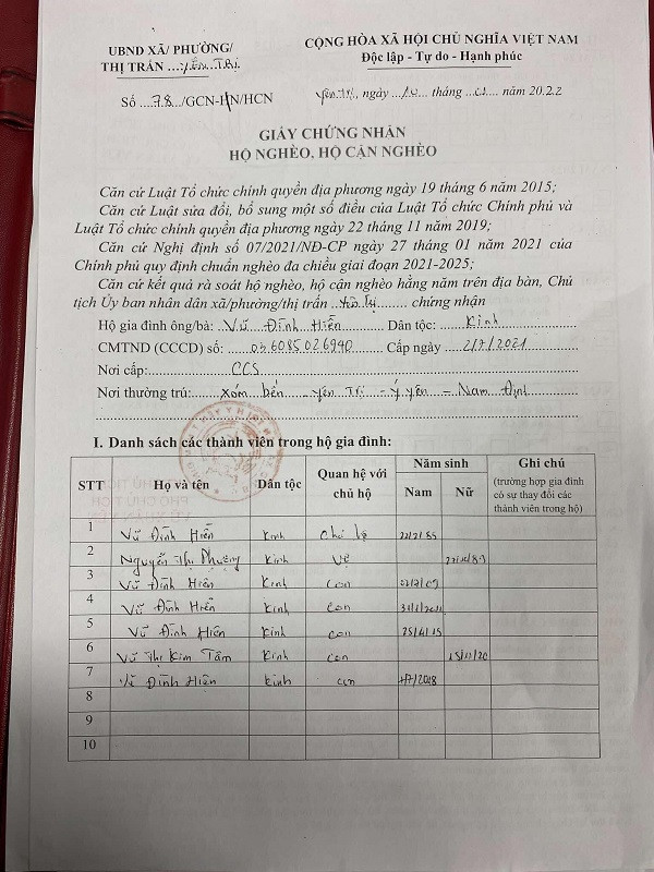 Mọi sự giúp đỡ xin gửi về: 1. Gửi trực tiếp: Chị Nguyễn Thị Phượng, xóm Bến, xã Yên Trị, huyện Ý Yên, tỉnh Nam Định. SĐT: 096 8776642. 2. Ủng hộ qua Báo VietNamNet: Ghi rõ ủng hộ MS 2025.058 (Vũ Đình Hiến) Chuyển khoản: Báo VIETNAMNET Số tài khoản: 0011002643148. Sở giao dịch Ngân hàng Ngoại Thương Việt Nam - 198 Trần Quang Khải, Hà Nội - Chuyển khoản từ nước ngoài: Bank account: Báo VIETNAMNET - The currency of bank account: 0011002643148 - Bank:- BANK FOR FOREIGN TRADE OF VIETNAM - Address: 198 Tran Quang Khai, Hanoi,Vietnam - SWIFT code: BFTVVNV X - Qua TK ngân hàng Vietinbank: Chuyển khoản: Báo VietNamNet Số tài khoản: 114000161718 Ngân hàng TMCP Công Thương Việt Nam - Chi nhánh Đống Đa - Chuyển tiền từ nước ngoài: Vietnam Joint Stock Commercial Bank for Industry and Trade, Dong Da Branch - Address: 183 Nguyễn Lương Bằng, quận Đống Đa, Hà Nội - Swift code: ICBVVNVX126 3. Hoặc trực tiếp báo VietNamNet: - Phía Bắc: Địa chỉ: Tầng 18, Tòa nhà Cục Viễn thông (VNTA), số 68 đường Dương Đình Nghệ, phường Yên Hòa, quận Cầu Giấy, TP. Hà Nội. - Phía Nam: Văn phòng đại diện báo VietNamNet phía Nam, số 27 Nguyễn Bỉnh Khiêm, Quận 1, TP.HCM. Điện thoại: 19001081 |