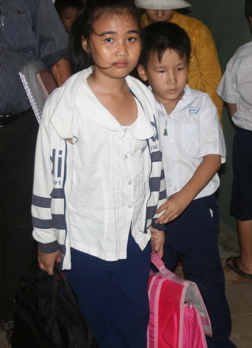 - Cơn mưa chiều đổ ập xuống cũng vừa lúc tiếng chuông tan học vang lên. Các học sinh của trường tiểu học An Phú Tây (xã An Phú Tây H. Bình Chánh TP.HCM) hớn hở rời lớp học ra về. Trong dòng học sinh đông đúc náo nhiệt đó, có 2 em nhỏ từ từ chậm bước. Bé gái 2 tay xách 2 cặp, bé trai đi bên cạnh níu vào tay bạn. Cả hai dìu nhau ra cổng trường . . .