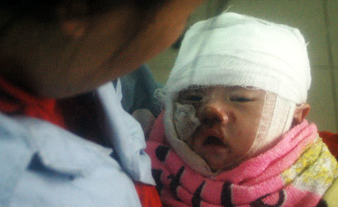 | Cháu bé mới hơn 30 ngày tuổi ở Nghệ An bị bỏng nặng do mẹ đánh rơi vào chậu than nóng trong khi bế con chạy thoát ra khỏi phòng. Bản thân chị P., mẹ cháu bé cũng bị ngất xỉu vì ngộ độc khí CO (Ảnh: Cẩm Quyên) |