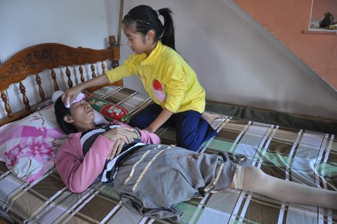 | Hàng ngày anh em Tùng thay nhau chăm sóc mẹ chờ phẩu thuật . |