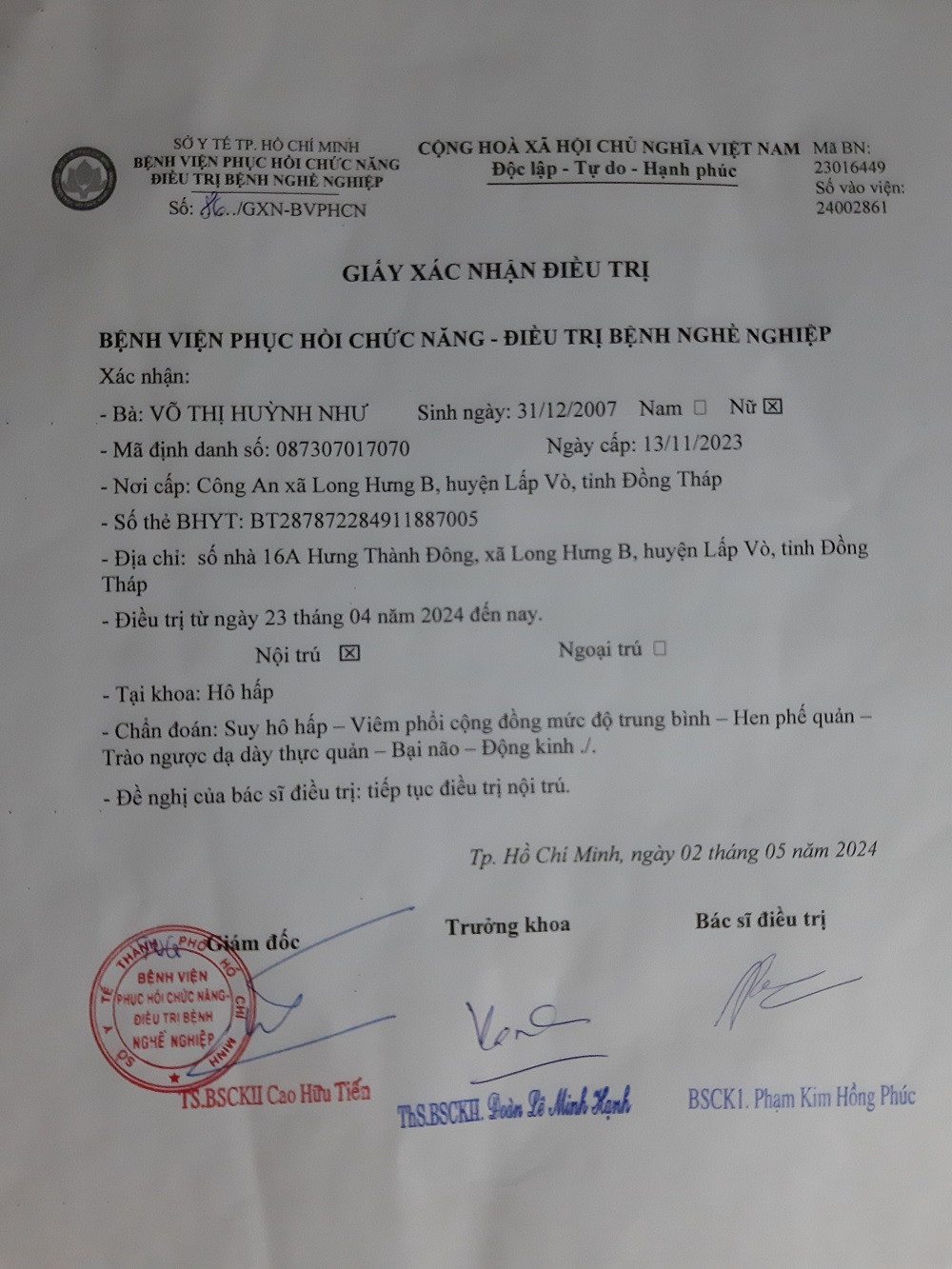 Bác sĩ Hoàng Thị Diễm Linh, Khoa Hô hấp cho biết, khoảng 2 tuần trước, Huỳnh Như được chuyển đến trong tình trạng viêm phổi, thể trạng suy kiệt. Em có nhiều bệnh nền mãn tính như bại não, động kinh, hen suyễn. Đến nay, em vẫn phải thở qua canuyn khí quản, thỉnh thoảng lại bị cơn động kinh. Dự kiến em còn phải điều trị lâu dài.