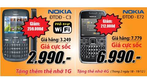 - Điện thoại di động Nokia E72, giá hãng 7.779.000đ, giá khuyến mại 6.990.000đ, tặng thẻ nhớ 4Gb (trong 2 ngày 18-19/12).