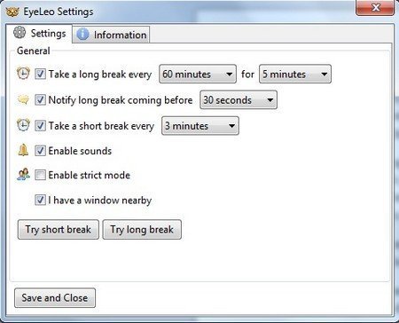 Sau khi đã hoàn tất các thiết lập phù hợp với nhu cầu sử dụng, bạn nhấn nút “Save and Close” để lưu lại các thiết lập. Trước đó, bạn có thể nhấn vào nút “Try short break” hoặc “Try long break” để kích hoạt thử nghiệm các chế độ nghỉ ngơi do EyeLeo cung cấp.