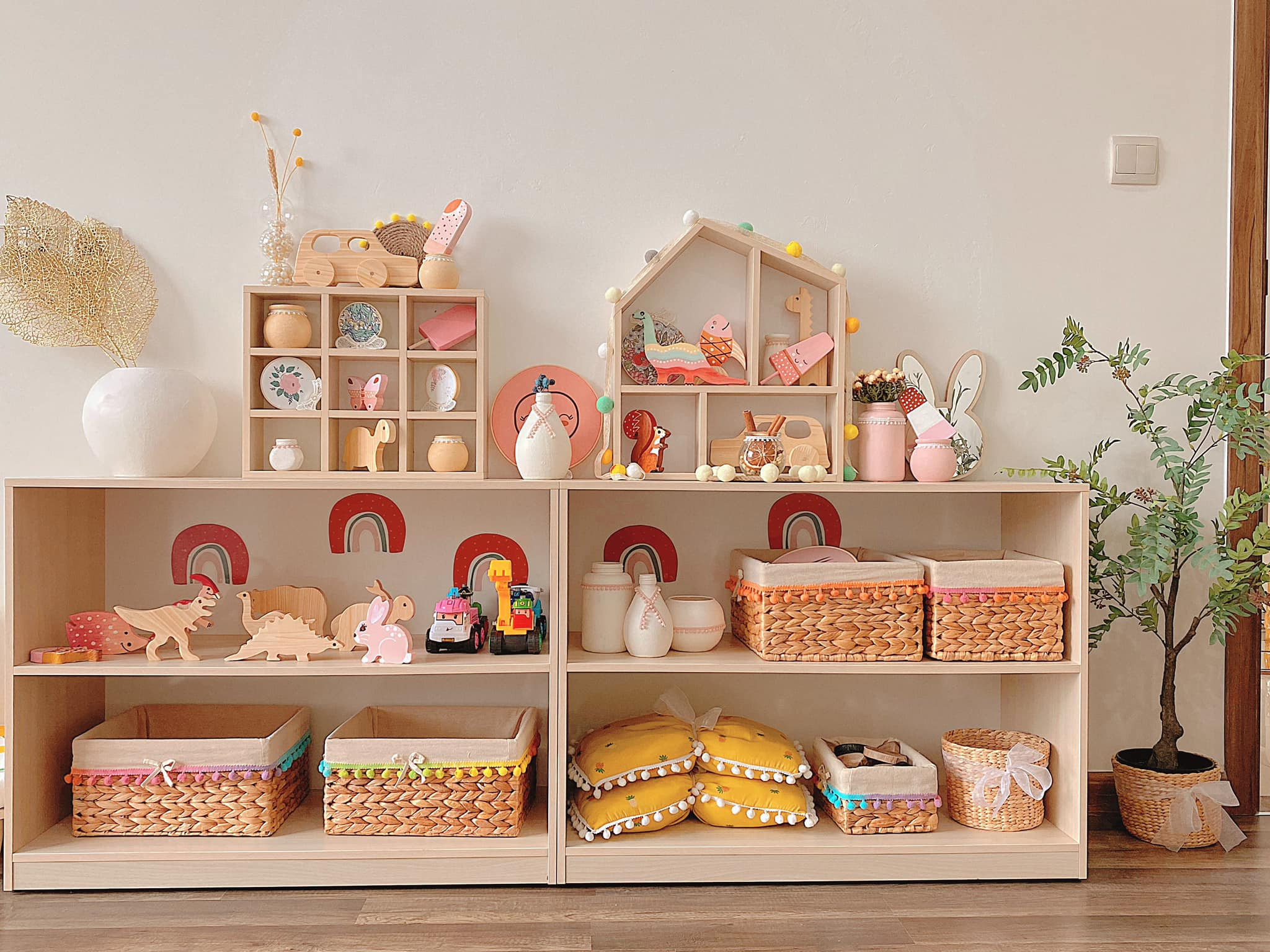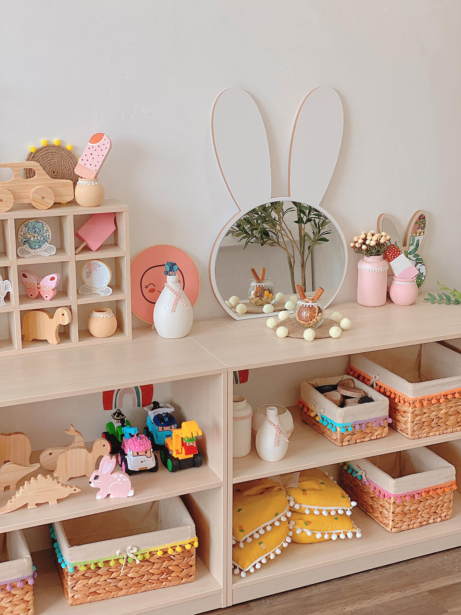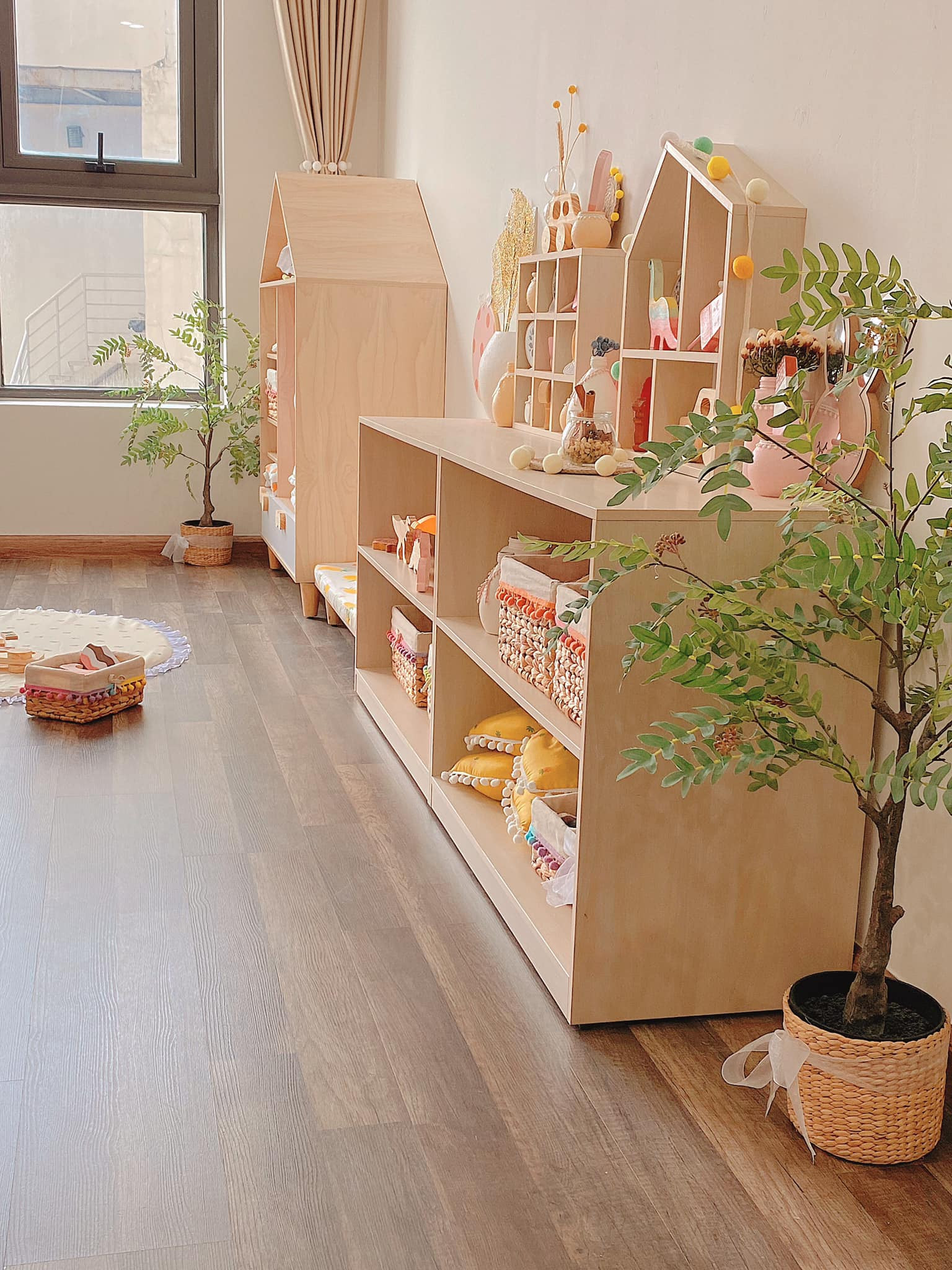 Tủ kệ đựng đồ chơi màu gỗ vàng nhạt, ấm cúng và gọn gàng. Không gian phòng hẹp nên chị Soda bố trí tủ kệ hai bên, để khoảng trống ở giữa có nhiều ánh sáng tự nhiên nhất cho con chạy nhảy, ngồi đọc sách hoặc bày đồ hàng…