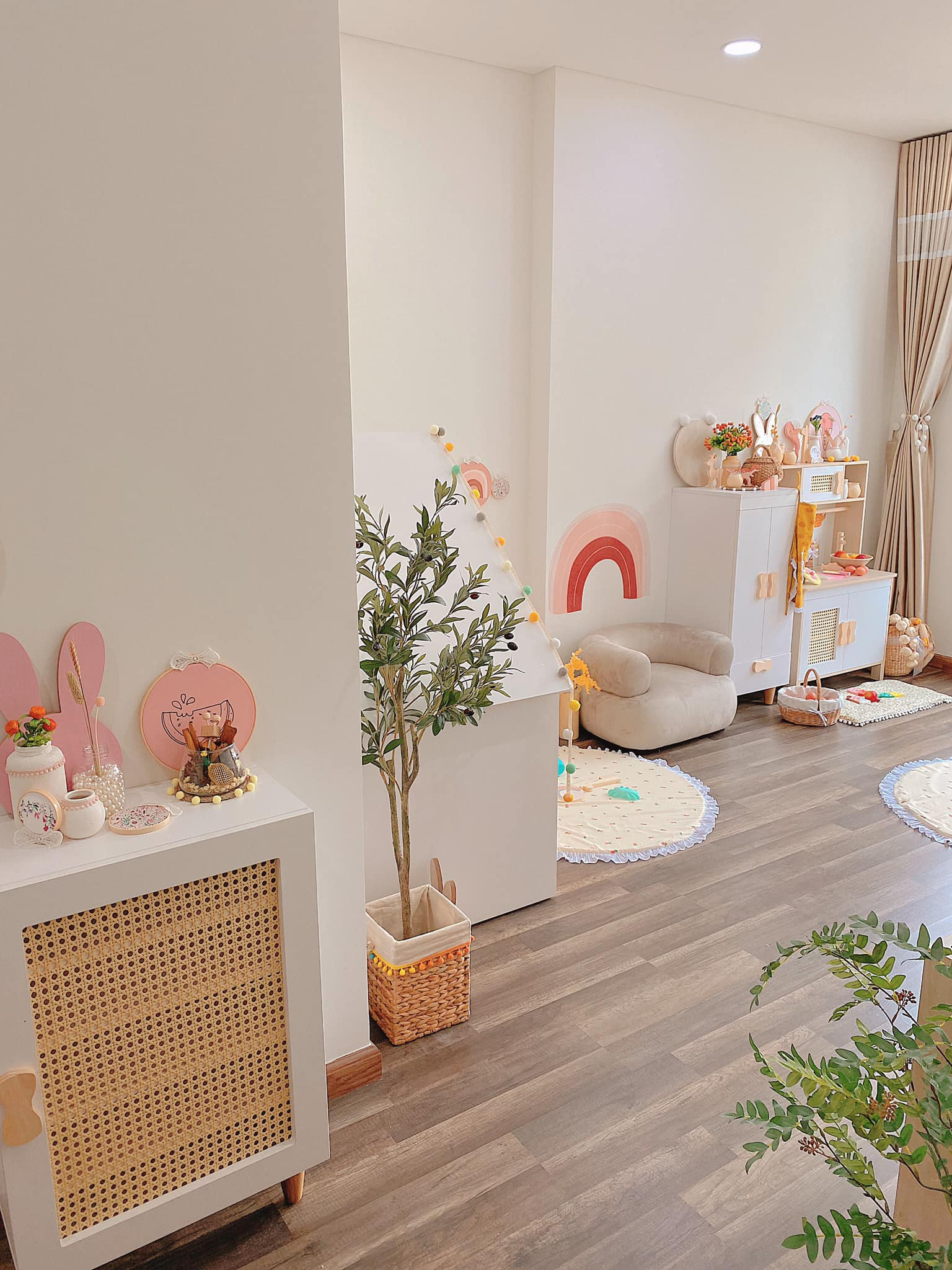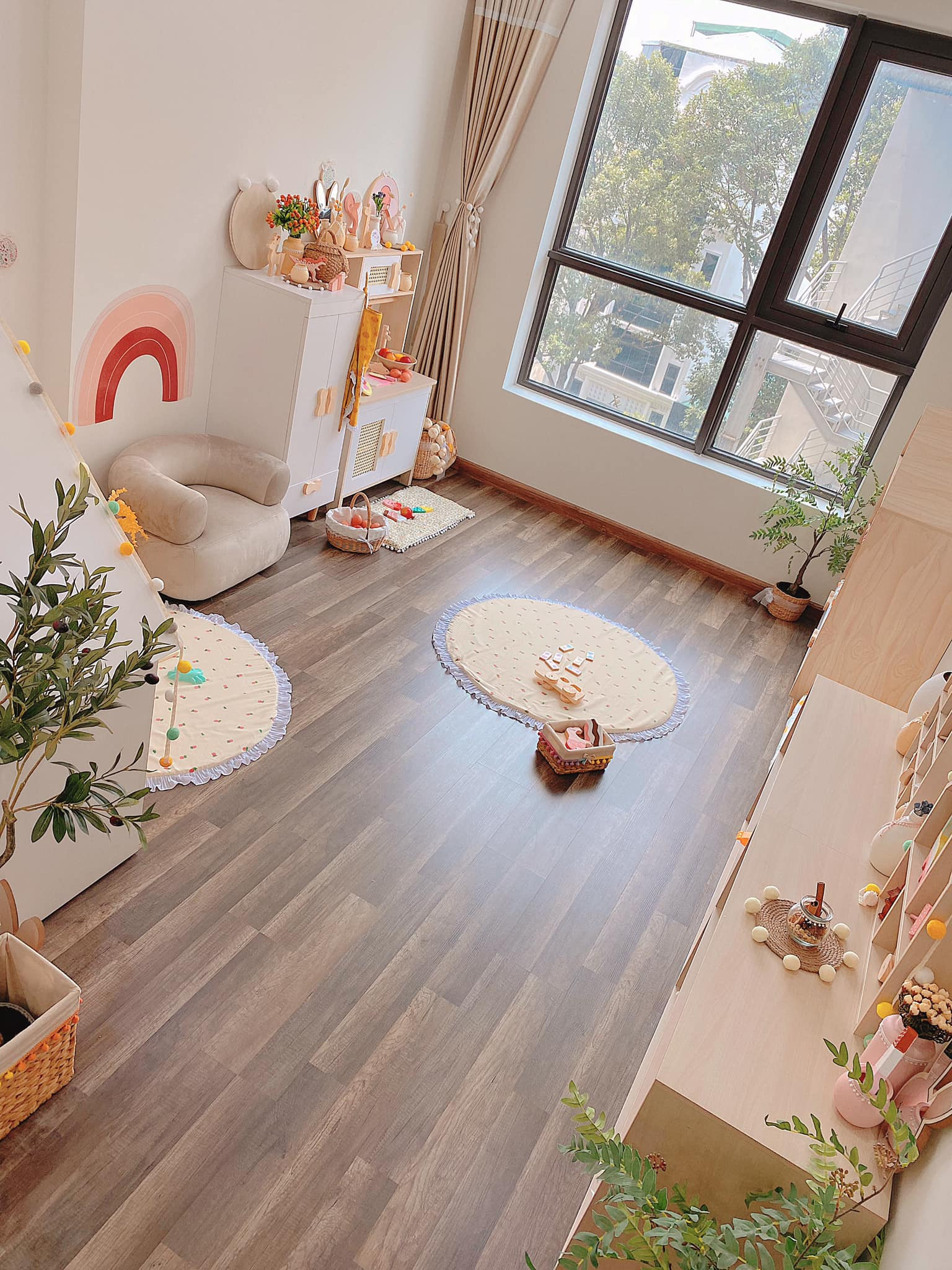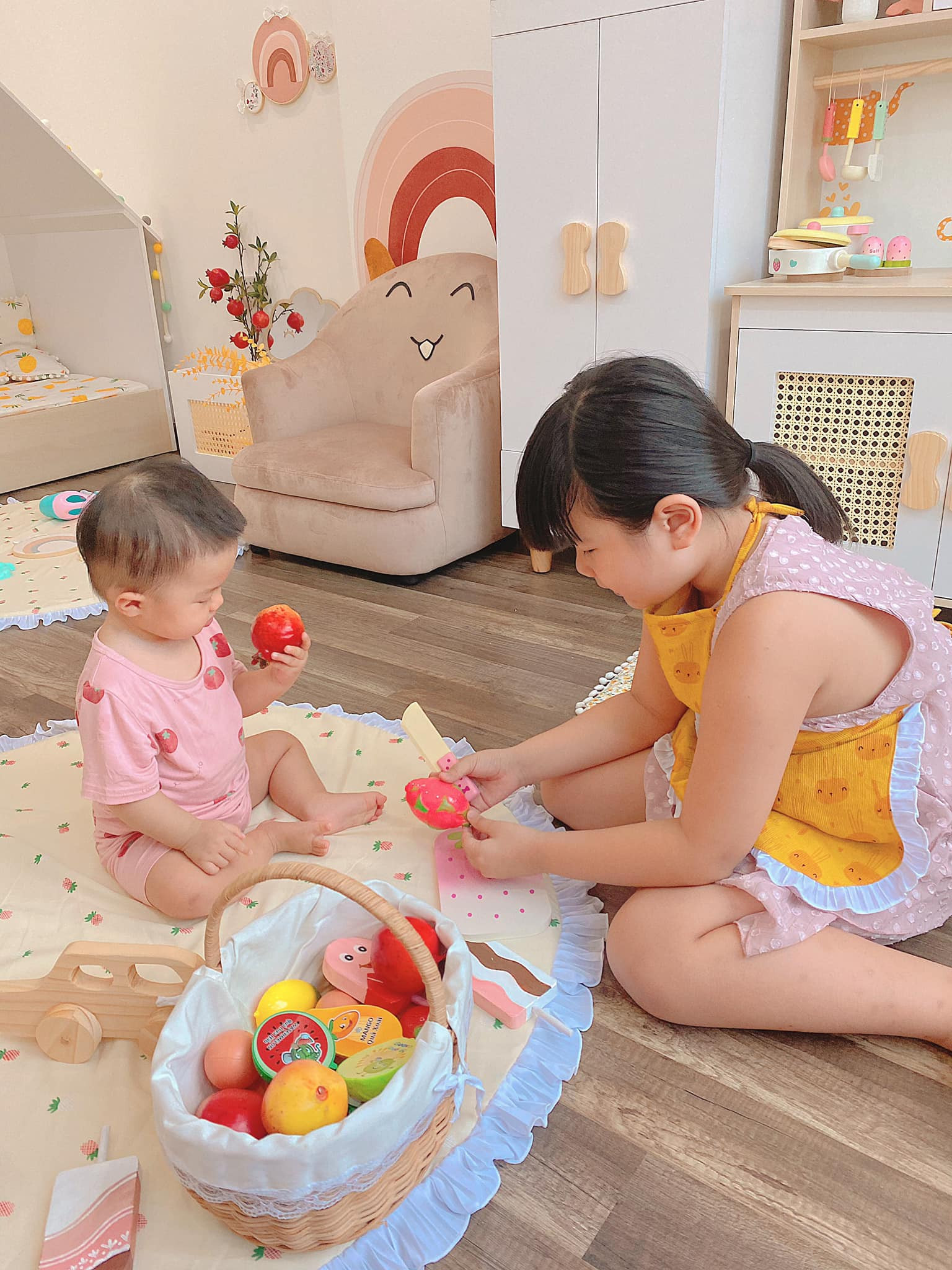 Hai bé là con gái, thích những đồ nhẹ nhàng, nữ tính như đồ hàng, may vá, búp bê nên cũng dễ dàng trong thiết kế, trang trí. Sau khi hoàn thiện, hai con chơi trong đó cả ngày không chán. Chị có thời gian rảnh làm việc, dọn dẹp và nấu nướng hơn.