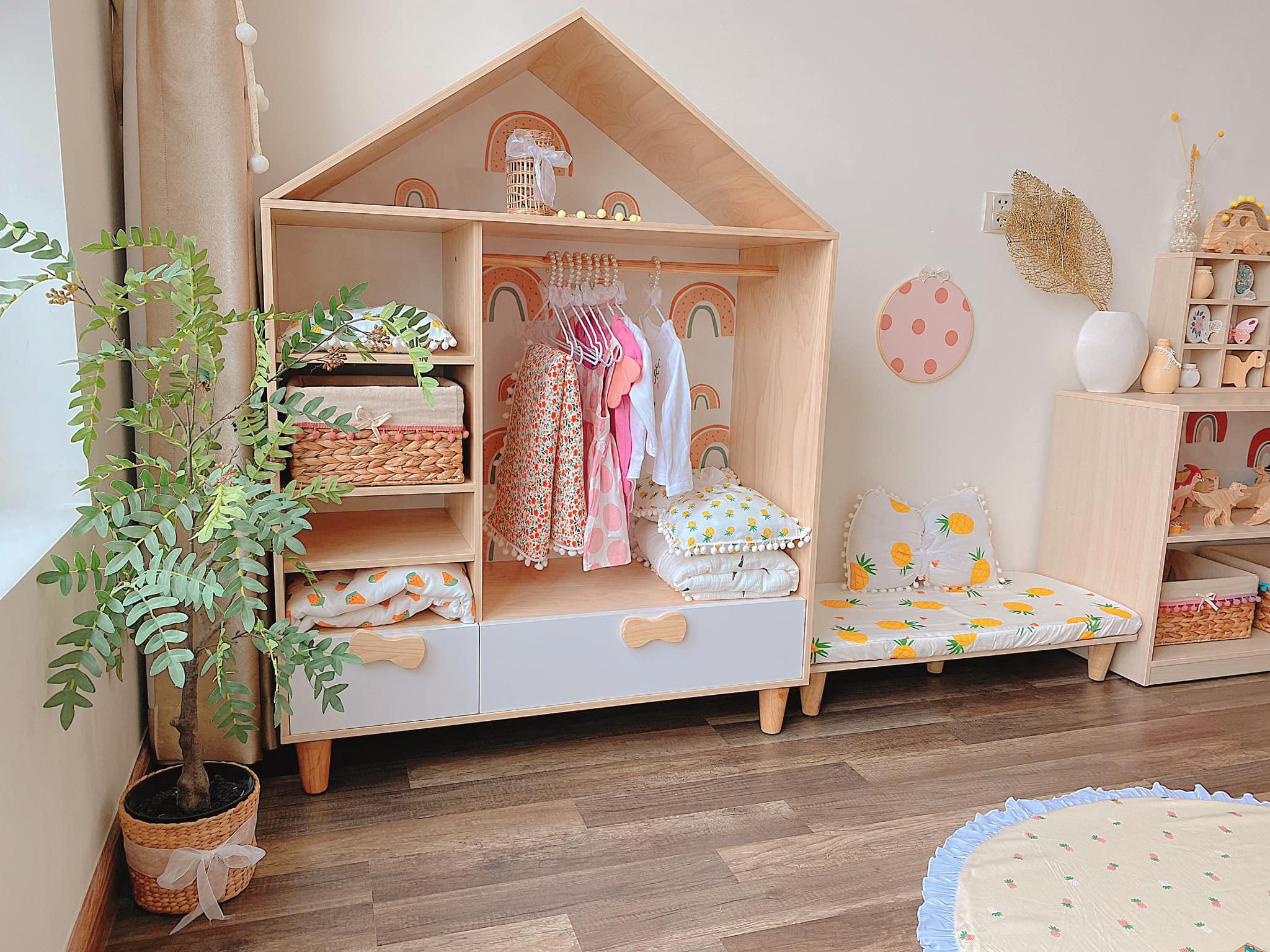 Tủ quần áo không cánh để treo đồ đi chơi, còn đồ mặc hàng ngày sẽ cất bên phòng bố mẹ cho thuận tiện.