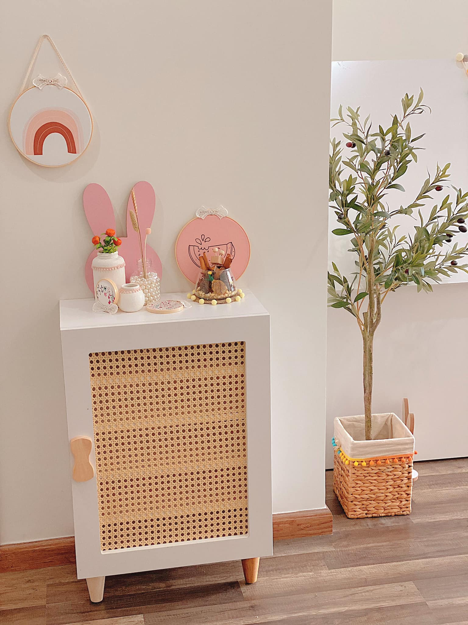 Cửa ra vào, chị Soda đặt 1 tủ kệ trang trí đan mây màu trắng, bên trên bày đồ decor màu hồng xinh xinh và lọ cam, quế khô khử mùi hôi cho phòng. Tủ kệ nhỏ này cất đồ chơi nhỏ hoặc sách, truyện… Cây giả khá giống thật cho không gian sinh động. Chậu cây đan bằng bèo khô, chi phí chỉ vài chục nghìn nhưng hiệu quả trang trí rất cao.
