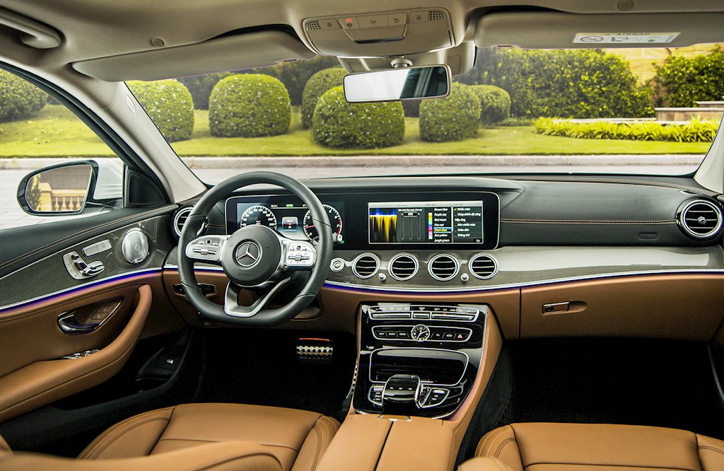 E 200 Sport được trang bị nội thất ốp nhôm vân carbon, phối gỗ đen vân nổi tương phản thú vị. Mẫu xe sở hữu cửa sổ trời panorama, camera 360 toàn cảnh, hệ thống âm thanh vòm Burmester 13 loa và hệ thống lọc không khí thông minh Air Balance.