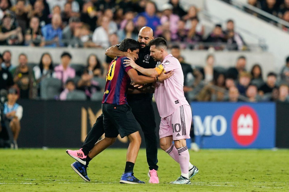 Đáng chú ý, một CĐV mặc áo đấu Barcelona in tên Messi phía sau bất ngờ lao xuống sân hướng về phía thần tượng.
