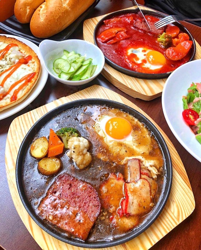 Từ những nguyên liệu đơn giản như xúc xích, cà chua, pate, chả, thịt bò... bạn có thể chế biến ngay phần mì chảo thơm ngon tại nhà. Ngoài ra, bông cải xanh hoặc xà lách sẽ giúp món ăn thêm bắt mắt và hấp dẫn. Ổ bánh mì nóng giòn được cắt lát chấm nước sốt đậm đà và ăn kèm phần nhân trong chảo tạo sự hài hòa trong hương vị. Ảnh: Damanfood, Bachuaviahe.